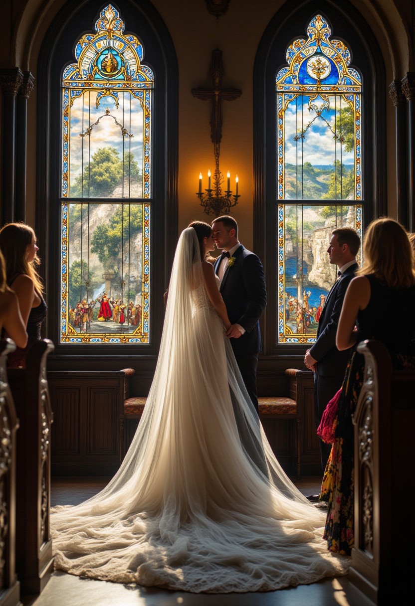 A timeless woman with era-reflecting eyes and hair shifting styles by the second. Her wedding dress blends Victorian lace, medieval brocade, and futuristic metallics. Her chronal-energy veil distorts the air. She stands in a chapel with shifting stained glass of history. Guests from various eras watch her marry a figure of pure light. , aidmamj6.1, aidmaHyperrealism, aidmafluxpro1.1