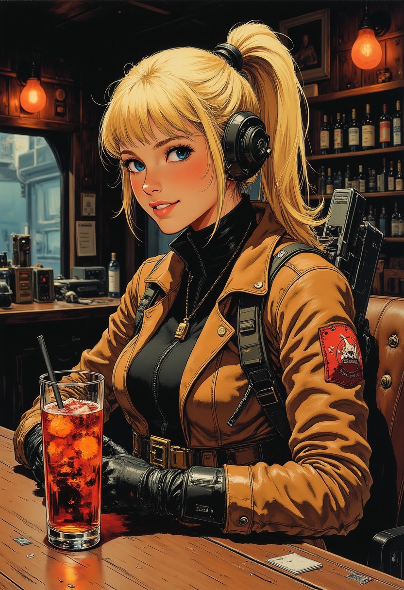 sp4c34n1m3, A bounty hunter lady in a seedy, dimly lit bar. She wears a long, brown colored coat over her advanced armor. Her blonde is hair tied into a ponytail. She smiles as he sits at a table with her drink and her laser gun in front of her.