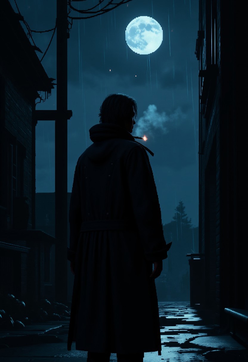 (detective, noir, rainy night, urban, cinematic, mysterious) A hard-boiled detective in a trench coat stands under a flickering streetlamp in a rain-soaked alley. The dim light casts long, dramatic shadows as he peers into the darkness, a cigarette glowing faintly, embodying the essence of classic film noir. , pinkpixelicious, aidmamj6.1, aidmabaldursgate3