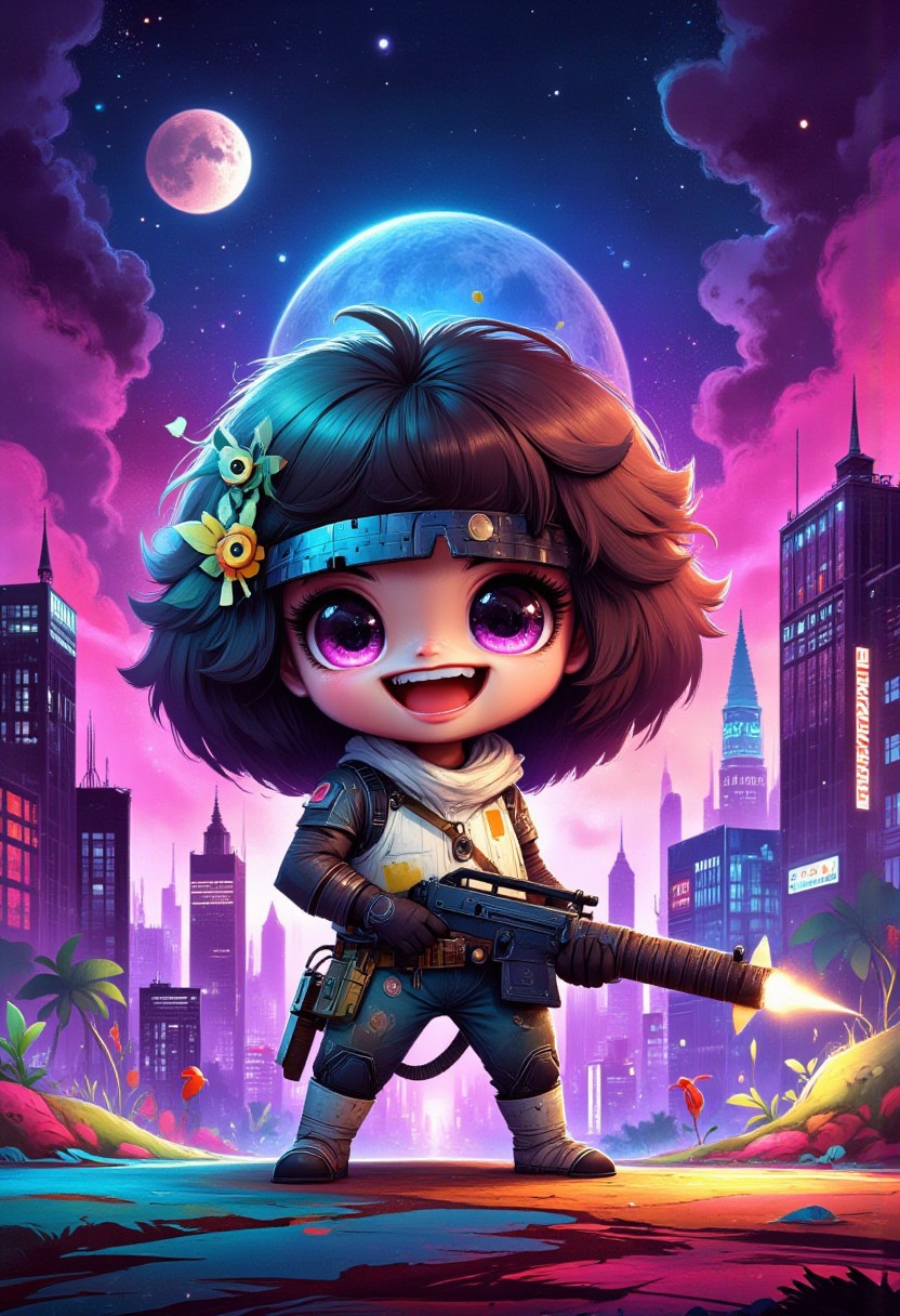 A vibrant chibi game character with exaggerated features, dressed in futuristic cyberpunk gear, set against a neon-lit cityscape at night. , aidmamj6.1, ppstorybook