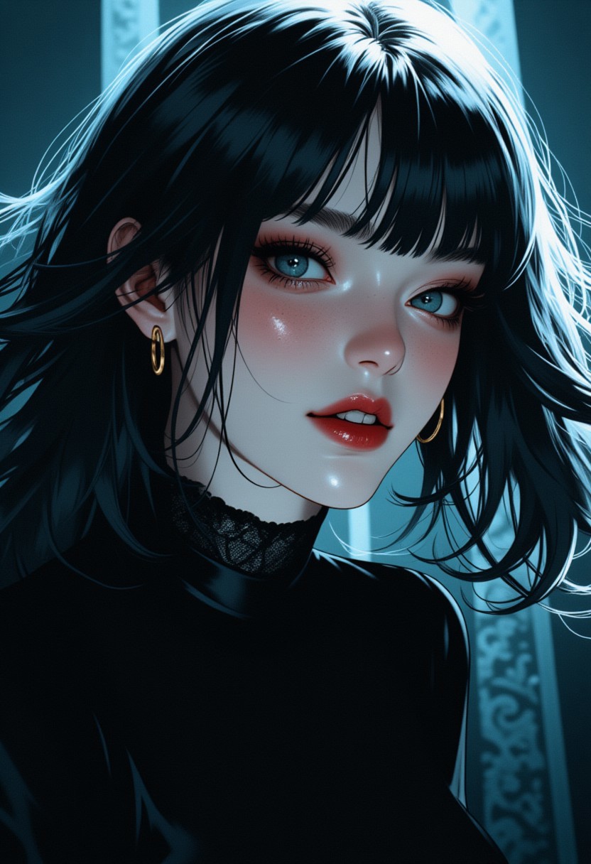 Niji_anime ,A mesmerizing anime-style digital illustration of a young woman with an ethereal, almost supernatural aura, captured in a cinematic close-up from a slightly tilted angle. Her porcelain-pale skin has an almost translucent glow under soft, diffused lighting, accentuating the contours of her delicate features. Her striking blue eyes, framed by long, thick lashes, hold an intense, almost hypnotic gaze, subtly enhanced by the reflection of cool moonlight. Her flowing dark hair cascades around her shoulders, with a single bold white streak falling across her face, partially veiling one eye, adding an air of mystery. She wears a high-necked, sleek black garment, its smooth fabric contrasting with the intricate lace of a delicate black choker around her throat. A small gold hoop earring glints on her left ear, catching the ambient glow. Her lips, painted a deep, vibrant red, create a breathtaking contrast against the monochromatic palette, drawing attention to her enigmatic expression—a faint, knowing smirk that suggests both confidence and secrecy. The background shifts to a dreamlike, gothic-inspired setting, where blurred, ornate patterns and swirling mist add depth and intrigue, enhancing the moody, atmospheric feel of the piece. The illustration employs masterful shading and delicate highlights to bring realism to the anime aesthetic, blending gothic elegance with a modern, high-fashion sensibility. The interplay of shadows and soft moonlight adds a cinematic depth, immersing the viewer in the character’s hauntingly beautiful presence.