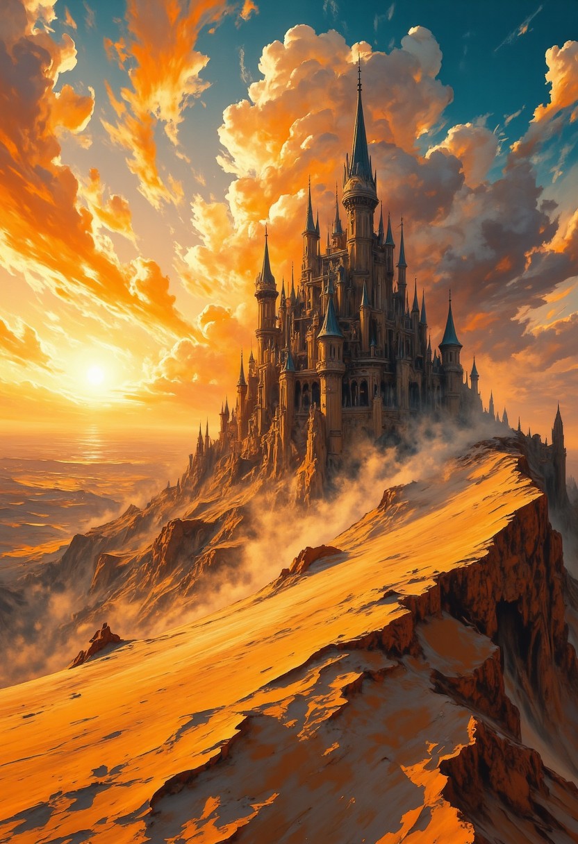 A landscape of tall dunes in a desert the stretches to the horizon. The sun is just rising above the horizon, painting the sky in vivid hues and lighting the dunes and the sand. Epic clouds catch the sunlight and a storm seems to be building in the distance. The dunes move like waves. A walking castle strides the dunes, huge and strange.