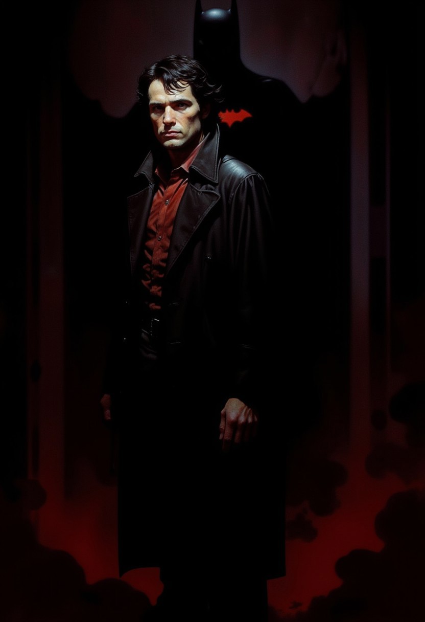 A hyper-realistic digital portrait of a man with pale skin and messy, medium-length black hair styled in a slightly spiky fashion, his sharp, angular facial features radiating intensity and seriousness. He wears a long, black trench coat with a sleek, matte texture, its collar turned up dramatically, slightly open to reveal a deep crimson red shirt beneath that adds a bold, sinister contrast. Standing with his hands casually in his pockets, he exudes a calm yet mysterious confidence. The background is a deep, shadowy black infused with faint red gradients and atmospheric haze, creating a moody, cinematic ambiance. Behind him, the shadow cast by his figure forms the iconic silhouette of Batman, outlined in a soft crimson glow that reinforces his symbolic duality and inner strength. Directional lighting sculpts his face and attire with sharp highlights and deep shadows, while the crimson of his shirt glows subtly against the dark palette. The entire composition evokes a noir-inspired intensity, blending realism and symbolic power. Every detail, from the fine textures of his coat to the gleam of his hair, is rendered in flawless HD, 8K quality, ultra-detailed, flawless anatomy, digitally drawn.