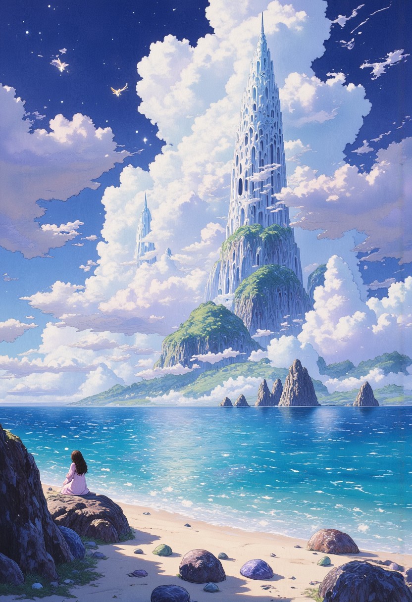Studio Ghibli Whimsical Fairytale – giant Wave, shore, pebbles, Landscape scenery, pastel moody, hyperdetailed Clouds, lndscpx, towering Fantasy tower resembling a female body