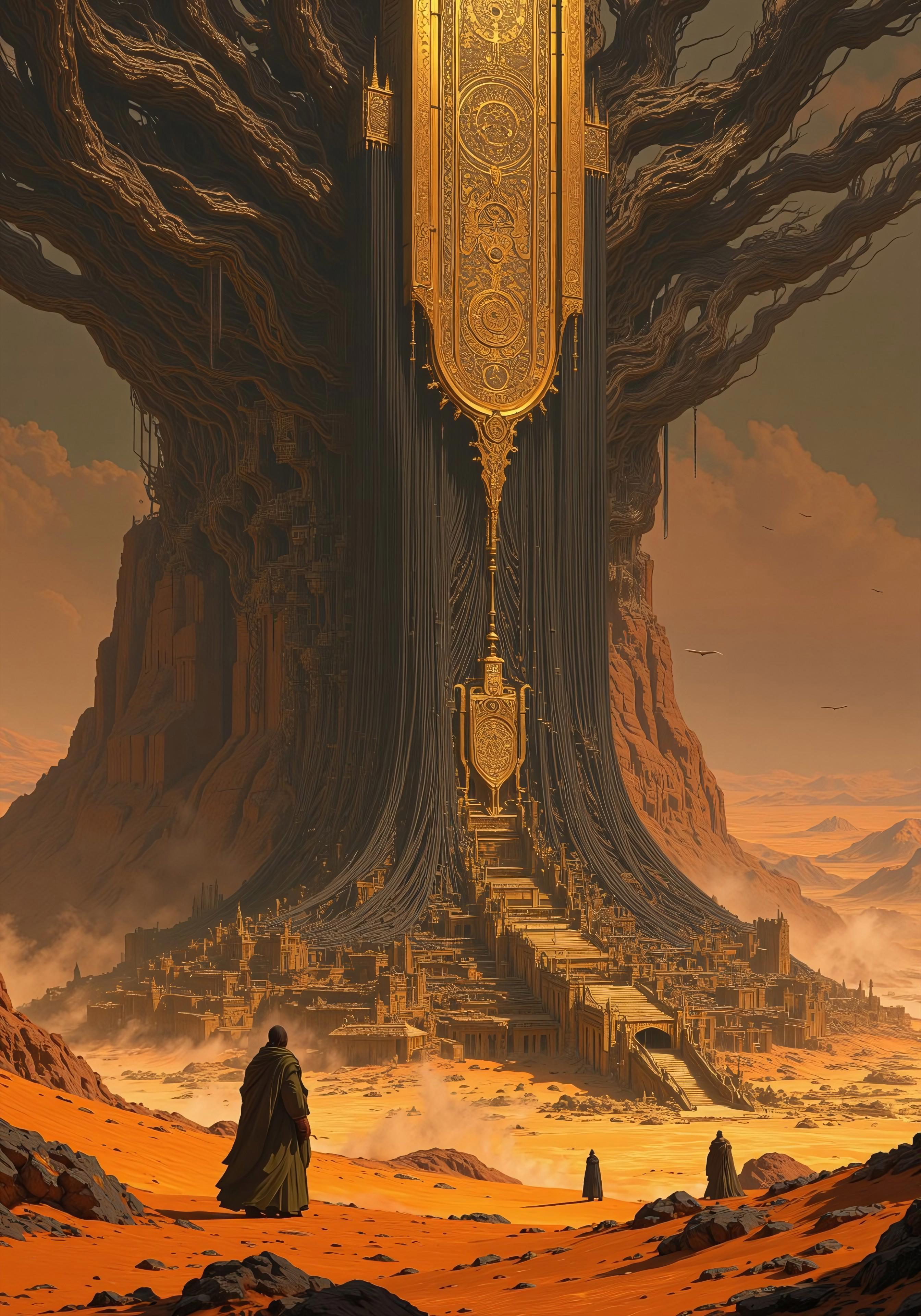 A towering tree-machine rooted in an arid valley, its branches made of cables and bronze tendrils reaching for a broken sky, glowing softly with forgotten energy, sector 404, ancient sci-fi sanctum, towering desert shrines, ritualistic architecture fused with arcane technology, monumental mechanical deities, intricate metalwork and sacred engravings, orange-ochre dunes, golden accents with aged patina, ambient volumetric light, ultra-detailed, cinematic digital painting, distant robed figures for scale, painterly texture with subtle grain, highly atmospheric
