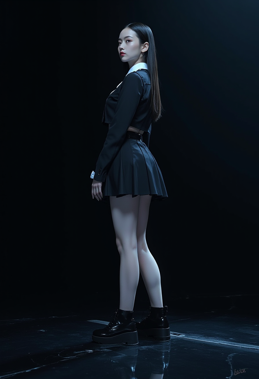 fashion photography,(full body:1), Endless black space, black mirrored floor. schoolgirl uniform, short skirt. dynamic pose ,full dressed , masterpiece, best quality, ,, swept-back hairstyle, graceful neck and shoulders, perfect body, (subsurface scattering:1.1), wide hips, Alabaster Skin, (glossy oiled skin:1.1), sharp focus, stark lighting, dramatic lighting, striking composition, confident and empowered woman, strong and assertive pose, sexy, sensuality, high end clothing, luxury accessories,dynamic pose, bdsm props, small breasts, wide hips, igiex. (clausore conclave, Catholic style). The background is minimalist, a gradient of shadowy blue tones, amplifying the ethereal and futuristic ambiance of the scene. The overall composition feels cinematic, blending high fashion with a science fiction aesthetic. . . (Depth of field), low saturation,detail. ,,. masterpiece, best quality, medium-format camera, high-contrast, dramatic lighting, striking composition, ,,. masterpiece, best quality, medium-format camera, high-contrast, dramatic lighting, striking composition, . (Depth of field), low saturation,detail. mythp0rt, charismatic., ,,. masterpiece, best quality, dramatic lighting,. An otherworldly atmosphere. (Depth of field), low saturation,detail. mythp0rt Stylish, charismatic.PA ,,sNOW wHITE, (Depth of field), low saturation,detail. mythp0rt Stylish, charismatic., belle (Depth of field), low saturation,detail. mythp0rt Stylish, charismatic. ,. . . full body. An otherworldly atmosphere, Mysticism. nigiex. . (Depth of field), low saturation,detail. mythp0rt Stylish, charismatic. (depth of field) mythp0rt, ,. ,. . An otherworldly atmosphere. (Depth of field), low saturation, detail. mythical, stylish, charismatic. , , masterpiece, ,Image quality, , CPA, UNI_SCI_FI_CORE.. .. , . igiex. .UNI_SCI_FI_CORE. j-art, j_art, illustration-fen,