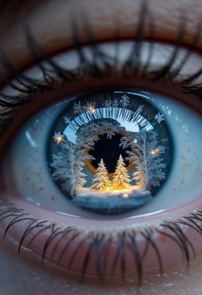 A super close-up of a woman’s eye, the iris a glowing snow globe, with whites and silvers swirling like snow, tiny golden trees glowing inside. A tattoo of a black snow globe base with silver snowflakes wraps around the white part, the snowflakes mixing into the iris’s snow like they’re falling from it. The pupil is a dark snowflake, holding the storm, shot in a cold silver glow with a Fujifilm X-T4, .raf file, making the snow globe and tattoo fill the whole frame. , aidmamj6.1, aidmaHyperrealism, aidmafluxpro1.1