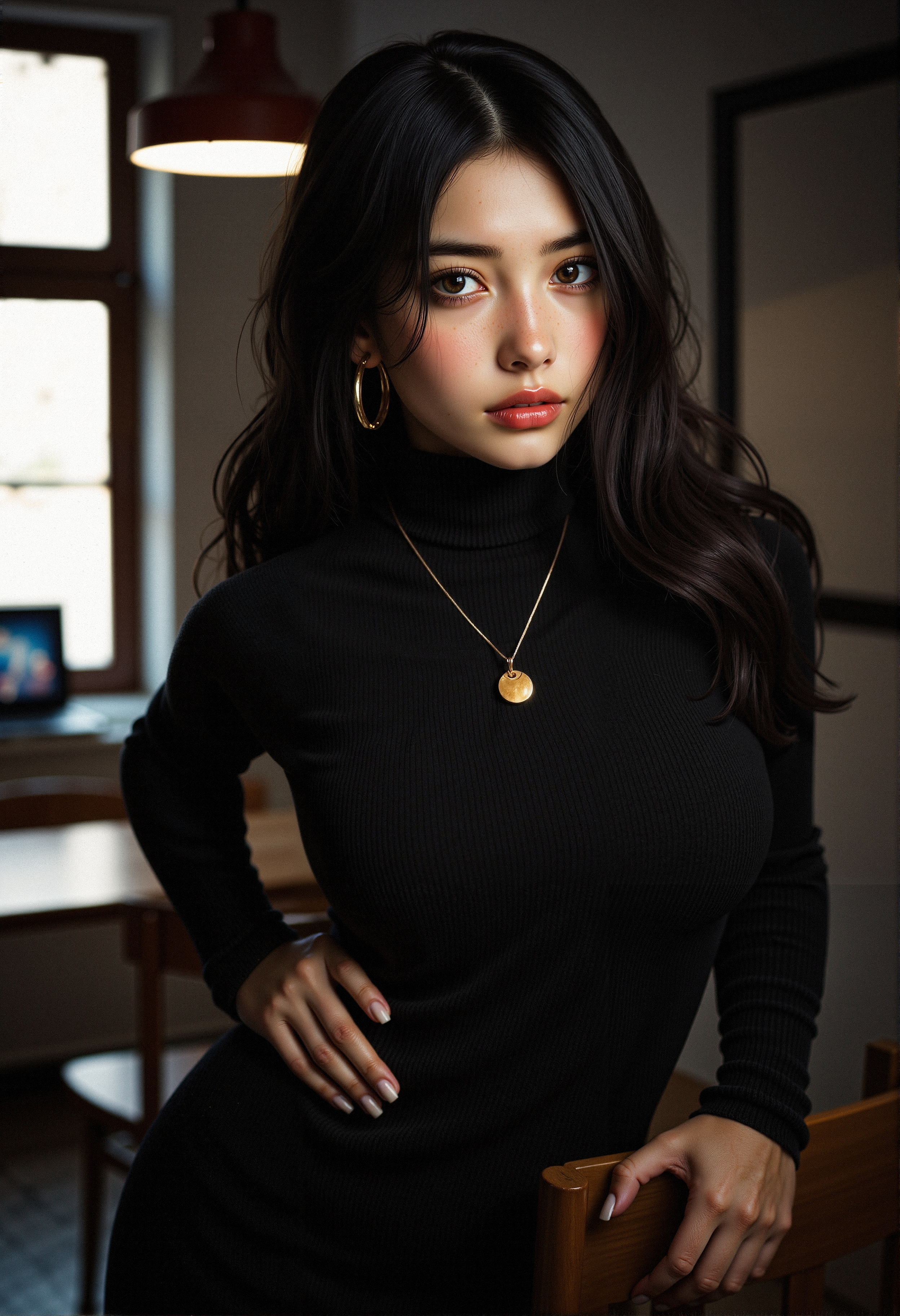hyper-realisitic, hyper-detailed, detailed clothing, detailed foreground, RAW photo, detailed clothing, detailed lighting, midjourney_whisper_innocent_eyes, curvy female, mature female, Imagine a photorealistic portrait taken in the same dimly lit dining room, but from a slightly different perspective that emphasizes the subject’s commanding aura. A young woman with sumptuous, raven-black hair stands near the table, her luxurious waves cascading to her mid-back. Her turtleneck top, crafted from a smooth black knit, accentuates her graceful neck and shoulders. Large gold hoop earrings glint in the sparse overhead light, drawing the eye to her elegant jawline. A delicate gold pendant, suspended from a slender chain, rests just above her sternum, completing the monochromatic yet sophisticated ensemble. The room remains shrouded in near darkness, with a single overhead fixture providing the only illumination. A soft beam falls across her face, revealing the subtle highlight on her cheeks and a gentle shimmer in her deep-set eyes. Behind her, a simple wooden table and a few chairs fade into the shadows, their outlines barely discernible in the gloom. The faint glow of an idle laptop screen at one corner of the table underscores the otherwise still, contemplative atmosphere. Her pose is assertively poised: she stands with her left hand lightly gripping the back of a dining chair, while her right hand rests on her hip, fingers splayed across the ribbed fabric of her turtleneck. Her weight is balanced on her right foot, causing her left leg to angle slightly inward, adding a sense of fluidity to her stance. Her chin is tilted upward just enough to catch the overhead light, accentuating the shape of her full lips. The camera frames her from mid-thigh upward, ensuring her voluminous hair, piercing gaze, and striking outfit remain the focal points without cutting off any part of her head. The lighting in this scene is subdued yet carefully orchestrated to produce dramatic contrast. The overhead lamp casts a warm, narrow pool of light across her face and torso, sculpting her features with gentle shadows. A faint reflection from the laptop screen contributes a cool undertone to the otherwise warm palette, subtly illuminating the left side of her silhouette. This interplay of warm and cool light lends depth to the image, making her figure pop against the muted backdrop. Rendered in sharp detail are the subtle textures: the fine knit of her turtleneck, the smooth metal of her hoop earrings, and the polished shine of her pendant. Even the faint lines of tension where her fingers press into the chair’s fabric are captured, emphasizing the moment’s realism. The table’s edges and the chair legs recede into near blackness, heightening the subject’s prominence and adding a sense of intimacy to the portrait. Overall, this composition exudes confidence, composure, and an undercurrent of anticipation. The interplay of dim ambient light and the subject’s assertive pose convey both power and elegance. In the hush of the darkened dining area, her presence feels almost magnetic, drawing the viewer’s eye to every glint of gold and every shadowed contour of her form. It’s a portrait that seamlessly marries the stark beauty of minimal lighting with the subtle drama of a poised, self-assured individual, leaving the viewer captivated by her poised stillness in an otherwise silent room. <lora:bustyFC-2.1:0.2> <lora:FluxDFaeTasticDetails:0.4> <lora:midjourney_whisper_innocent_eyes_v01:0.8>
