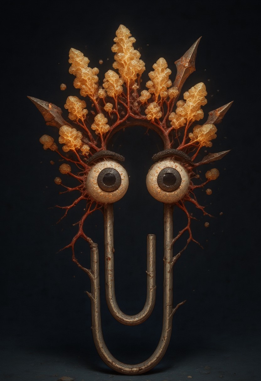dvrnfctd, an infected clippy with big eyes with crystalline fungal growths protruding from him like a crown of sharp coral, each node connected by red, vein-like tendrils that pulse with faint bioluminescence. His pupils are clouded