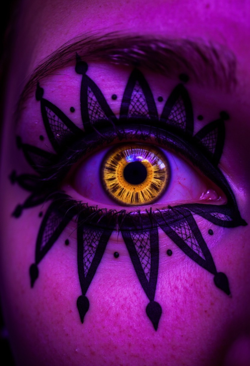 An ultra-close-up of a woman’s eye, the iris a glowing carnival mask, with deep purples and golds forming intricate patterns, tiny sequins shimmering inside. A tattoo of a black harlequin diamond pattern wraps around the sclera, its edges blending into the iris’s mask, as if the tattoo completes the disguise. The pupil is a dark mystery, hiding the wearer, shot in a festive purple glow with a Panasonic Lumix S1R, .rw2 file, letting the carnival mask and tattoo fill the image. , aidmarealisticskin, aidmaHyperrealism, aidmawomanbodytattoo