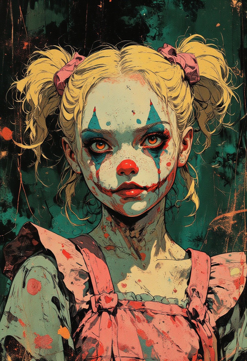 (in the style of cksc,, highly detailed, hyper realistic) a hyper-realistic painting blending surrealism and contemporary art, midshot of a girl with a vividly detailed clown face. Her expression is neutral and haunting beneath exaggerated clown features — a bright red nose, blue and red tear-like streaks flowing from her eyes, and a small heart-shaped mouth painted in vivid crimson. Her curly blonde hair is styled in high pigtails, each tied with oversized pink bows, adding a whimsical yet eerie contrast to her unsettling makeup. She wears a soft pink dress patterned with faint diamonds, its delicate fabric rendered with textured brush strokes that contrast the glossy, smooth finish of her painted face. Around her, the background dissolves into abstract swirling textures — a seamless gradient of dark green, turquoise haze, and streaks of shimmering bronze. These flowing tones blend outward from her face, dissolving form into a boundless dreamscape. The lighting gently highlights the contours of her face and the shine in her hair, while shadows remain subtle, enhancing the dimensional detail without overpowering the scene. The composition merges hyper-realistic detail with painterly abstraction, creating emotional tension, surreal beauty, and a haunting, dream-like presence.