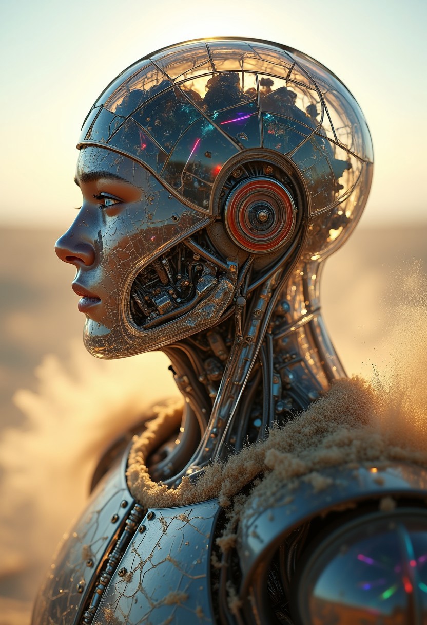 ajspctrbot. Cinematic, photorealistic extreme close-up of a war robot, constructed from semi-transparent, glass-like material, its once-pristine surface now shattered and fractured. Missing limbs and sections of its torso expose scorched, mechanical innards, while beams of light refract through the broken glass, casting colorful, distorted reflections across the desolate form. The robot's head is cracked, and parts of the faceplate are missing, revealing twisted, burnt metal underneath. Microfractures spider across its body, with mechanical parts twitching feebly beneath the damaged, soot-streaked plating. Dust and sand cling to its exposed components, and particles of dust float in the air, illuminated by harsh, directional light that slices through the haze. The background is a blurred, bleak desert wasteland, emphasizing the robot's broken and abandoned state.