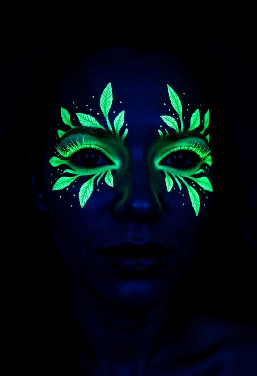 Eyes painted with a bioluminescent jungle theme, where glowing vines and neon-green leaves curl across the lids, accented with tiny, luminous insect-like dots. The lashes are elongated with feather-like extensions that pulse faintly, and her irises glow like emerald fireflies. Shot in a dark, humid studio with ultraviolet accents, using a Sony A9 II, .arw file, focusing on the vivid luminescence. , aidmarealisticskin, aidmaHyperrealism
