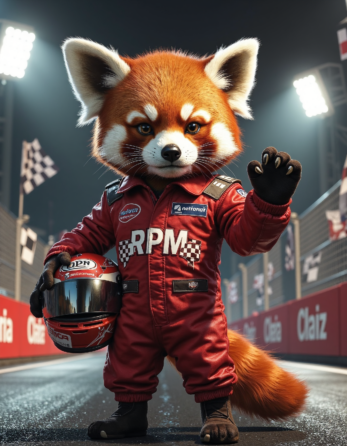 ZooPolis Art. High-resolution photograph of a red panda impeccably dressed in a racing suit adorned with "RPM" and checkered flags; holding a helmet with reflective visor; standing confidently on the asphalt of a racetrack, one paw raised in a gesture of readiness; surrounding environment captures the thrill of racing with chequered flags fluttering in the breeze, spotlights illuminating the scene, shadows creating dramatic contrasts; red panda's expressive features convey determination and spirit; composition merges playful character with high-energy racing atmosphere. High-quality image with sharp focus and rich textures.