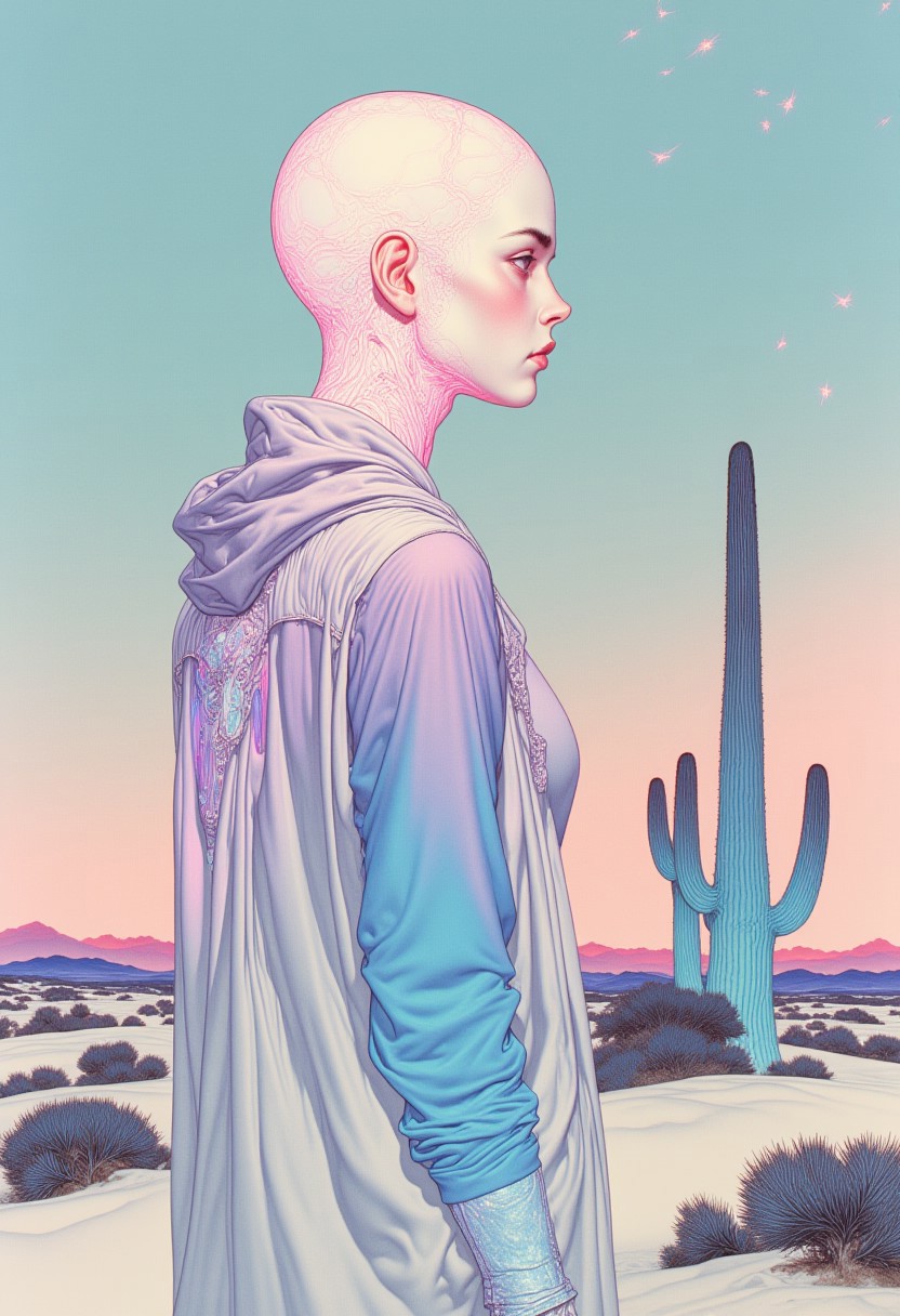 (ArsMJStyle, Colored pencil hyperdetailed realism, By Donna Young) A hyper-detailed digital illustration of a futuristic humanoid figure standing in a surreal desert landscape, their sleek cybernetic body shimmering with translucent aquamarine and opalescent hues. Their semi-transparent head shifts between lavender and iridescent cyan, revealing delicate neural pathways and pulsating circuitry flowing like liquid light. The neck is encased in intricate crystalline gears and fiber-optic strands glowing with a ghostly pink-blue luminescence. They wear a semi-transparent high-tech jacket in pearl and glass-like sapphire, its prismatic reflections rippling as it blends seamlessly with their radiant form. Behind them, a massive pastel-pink sun dominates the sky, diffusing waves of light through a dreamlike gradient of translucent violet and ethereal cerulean. To the right, a towering saguaro cactus with a pale jade, glass-like structure refracts light like a gemstone, while smaller crystalline cacti in shades of mint and opal rise from smooth iridescent dunes shifting between pearl-white and soft periwinkle. In the distance, fluid-like mountains in translucent lilac and misty blue stretch across the horizon, their peaks glowing faintly under the surreal light. A flock of ghostly luminescent birds soars overhead, their flickering pastel forms adding motion to the dreamlike, immersive composition.