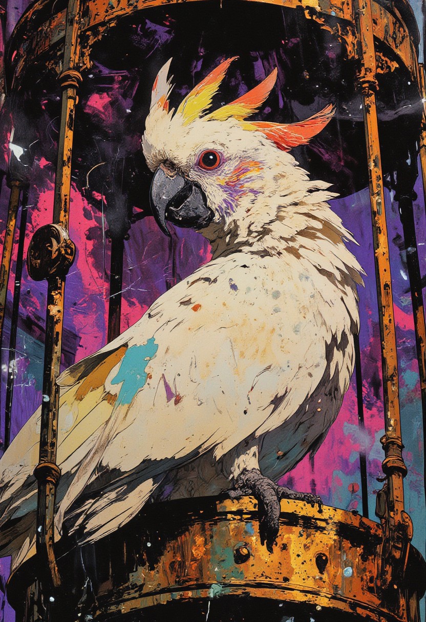 (in the style of cksc,, highly detailed, hyper realistic) A Moluccan Cockatoo perched inside an ornate, antique cage. The extreme close-up focuses on the bird’s striking pale white eye, surrounded by sharp, contrasting black markings with streaks of crimson and violet on the face. Its pure white feathers shimmer with iridescent hues of electric blue, deep magenta, and metallic gold accents. The cockatoo's large crest stands out with vivid splashes of color, while the slightly open beak glimmers with a metallic sheen. Intricate details of the bird’s feathers, particularly the tail, are captured with fine, delicate brushstrokes. The antique cage surrounding the bird is adorned with intricate filigree, emphasizing its confinement. The background is abstract, a blend of dark plum, violet haze, and shimmering silver streaks, creating an ethereal, dreamlike atmosphere. The scene is meticulously crafted with a balance of realistic textures and surreal, vibrant color elements.