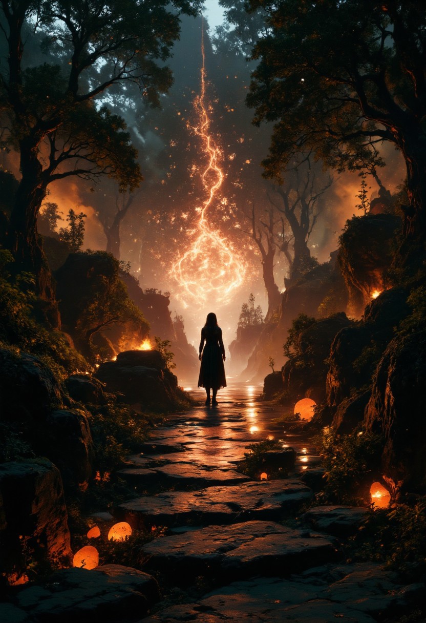 wonderful and mesmerizing scenery on a distant world, very aesthetic, extremely detailed and realistic, professional artwork, 8k, 4k, ultra-high-resolution, fantasy style scenery with art nouveau and elven influences, a tranquil, narrow stone path winding through the woods at sunset, the path leads to one beautiful red tree illuminated by what is left of the sunlight in an otherwise dark forest, small particles of light are floating and increase the closer the path is to the tree, bioluminescent plants flicker gently among moss-covered rocks, the camera is positioned just above the path level, with a slight upward angle, creating an immersive perspective that draws the eye toward the soft vanishing point beyond the path and to the focus point, rembrandt style lighting enhances contrast between the darkening landscape cinematic tension, soft mist begins to settle in the canyon, diffusing the light from lanterns and casting ghostly reflections on the water, shot on 65mm film with a fine-grain emulsion and soft bloom filter, emphasizing contrast between artificial and natural light, twilight hues rendered with rich saturation and delicate tonal transitions, ovg, artilands02, <lora:style-fantastic_landscapes-v2-flux-by_artifyai:0.8>