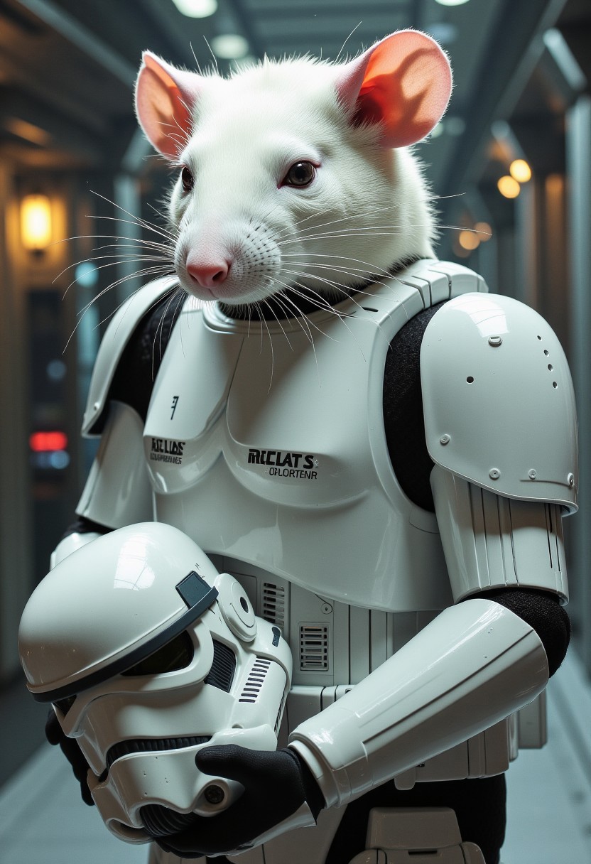 ZooPolis art. Imperial stormtrooper with a white rat's head — realistic fur texture, sharp pink ears, long whiskers. Standing upright, confident posture. Holds classic stormtrooper helmet under one arm. Glossy white armor with detailed shadows and reflections. Background: sci-fi corridor with soft ambient lighting. Subtle glow from control panels nearby. Slightly humorous, surreal tone. High detail, cinematic style. masterpiece, best quality, realistic.