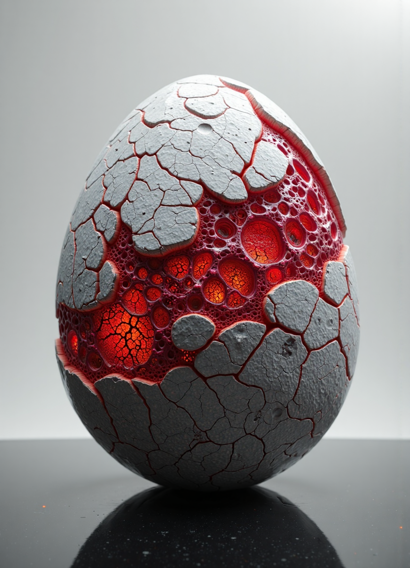 cinematic photo Capture a highly stylized and surreal still life featuring a large, flawlessly smooth, and egg-shaped object, reminiscent of a precious stone or a futuristic artifact, resting on a perfectly reflective, seamless surface, evoking a sense of sterile elegance and otherworldly beauty. The egg's base coloration should be a complex, mottled grey, incorporating subtle variations in tone and texture, suggesting a natural, geological origin yet possessing an almost manufactured precision in its form. This grey surface should appear subtly granular under close inspection, hinting at the intricate mineral composition beneath the polished exterior, and it needs to catch the light in a way that emphasizes the roundness and perfection of the shape. Upon the upper portion of this egg-like form, meticulously render a network of vibrant, crimson-red, branching structures, resembling delicate coral, intricate veins, or perhaps a map of an unknown landscape. This red network should not appear painted or applied, but rather organically grown from the surface, seemingly fused with the grey stone, creating a striking juxtaposition of textures and colors. The crimson structures should be sharply defined, with fine details and a translucent quality, allowing subtle light to filter through, hinting at an internal complexity. The red should exhibit a slight sheen, creating a captivating interplay of light and shadow, and contributing to the overall sense of mystery. The lighting should be soft and diffused, minimizing harsh shadows and highlighting the subtle textures of both the grey stone and the red network. A single, strategically placed light source should emphasize the egg's form and the intricate details of the red structures. The background should be a clean, neutral grey, allowing the egg to be the clear focal point of the image, while also echoing the color palette. The composition should be centered, conveying a sense of balance and harmony, while the close-up perspective will draw the viewer into the intricate details of the subject. The final image should possess a feeling of quiet contemplation, inviting the viewer to ponder the relationship between nature and artifice, the organic and the synthetic, the beauty of imperfection and the allure of the unknown. The overall aesthetic should be a blend of photorealism and surrealism, creating an image that is both visually stunning and intellectually stimulating. Consider a shallow depth of field to further isolate the egg and blur the background, enhancing the sense of isolation and mystery surrounding the subject. The final result should be a photograph that feels both familiar and utterly alien, a testament to the power of visual storytelling. . 35mm photograph, film, bokeh, professional, 4k, highly detailed