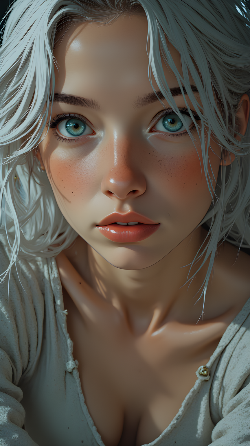 The portrait captures a moment of serene beauty, where the subject's face is framed by silvery-white hair that falls loosely around her shoulders. Her skin is fair, adorned with delicate freckles that dot her cheeks and nose, adding a touch of natural charm to her appearance. Her eyes are strikingâa piercing shade of blue, their irises bright and vivid, reflecting an inner light that draws the viewer in with quiet intensity. Her expression is calm yet expressive, her lips slightly parted as though she is caught in a fleeting thought or perhaps a quiet smile. The lighting is soft and even, highlighting the subtle contours of her face and accentuating the natural glow of her complexion. She wears a simple, textured garment that drapes gently over her shoulders, adding a sense of understated elegance to the scene. The overall impression is one of timeless grace and quiet confidence. There is a sense of vulnerability and strength coexisting within her presence, as though she embodies both resilience and introspection. The image feels intimate, capturing a candid moment where the subject seems to exist in perfect harmony with herself, inviting the viewer to linger on the intricate details of her features and the warmth of her gaze., <lora:FLUX\jul\J_Anime:0.7>, <lora:FLUX\RealAnime:0.7>