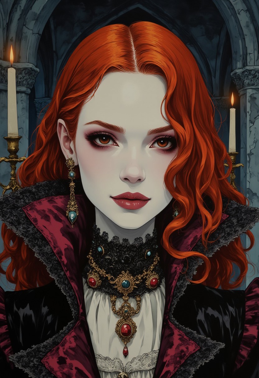 in the style of cksc, oil painting technique, A Closeup Portrait of an aristocratic vampire, her pale face framed by elaborate Victorian collar and flowing auburn hair. Her hypnotic gaze fixes directly on the viewer, centuries of cunning visible in her slight smile. Blood-red lips contrast with porcelain skin that has never seen sunlight. Hyperdetailed period jewelry adorns her throat and ears, each piece telling a story of past victims. Candlelight casts unnatural shadows across her features. Gothic architecture barely visible in the darkened background. Deep burgundies and midnight blues with highlights of gold.