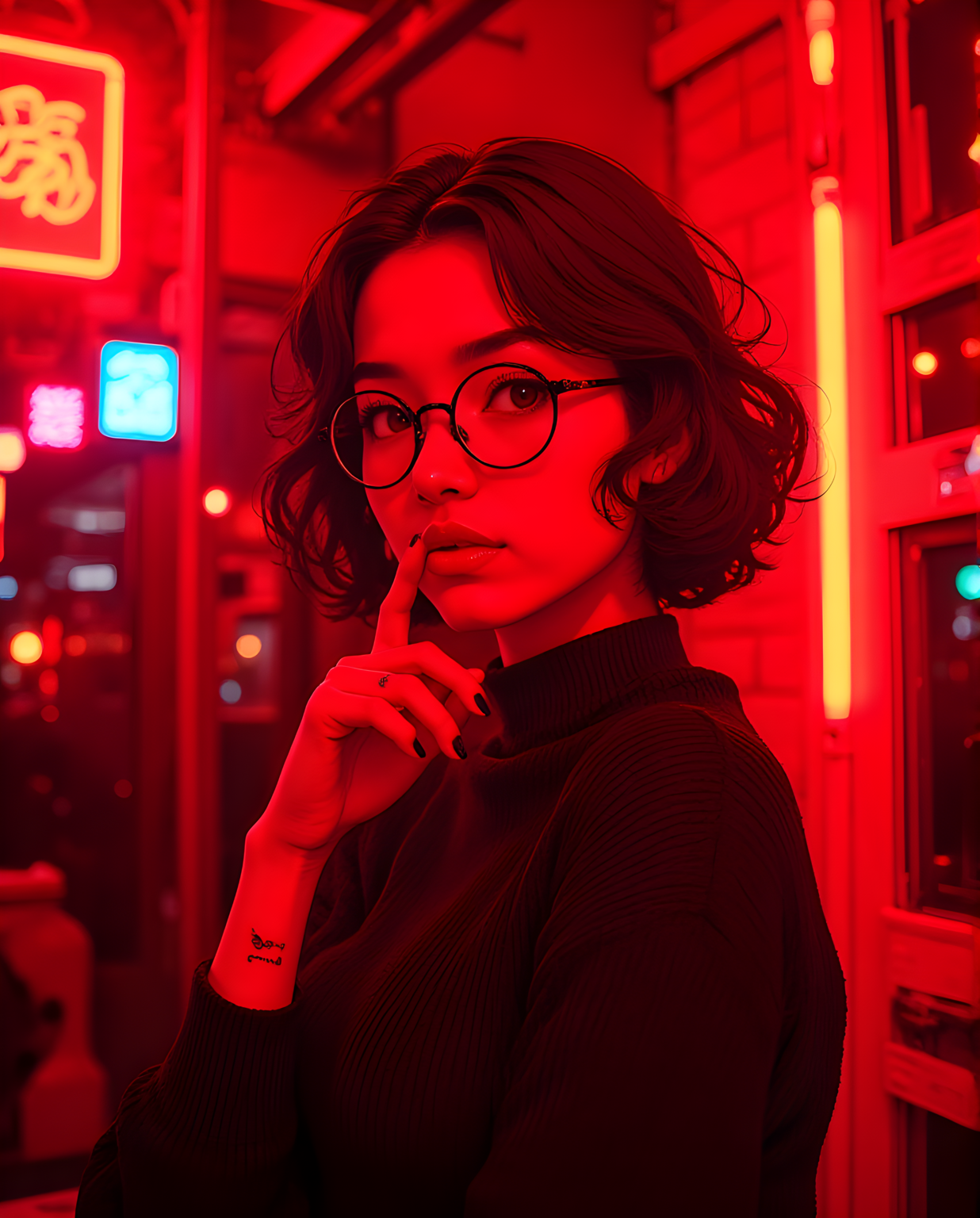 The scene is a striking portrait bathed in the glow of vibrant red neon lights, creating an atmosphere that feels both intimate and enigmatic. The subject stands as the focal point, her presence framed by the bold hues of the background. Her hair is styled in loose waves, its rich brown tones catching the light subtly, adding texture to her appearance. She wears round glasses with thin frames, which lend her an air of intellectual charm and approachability. Her expression is calm yet thoughtful, her gaze directed slightly off-camera, as though she is lost in quiet contemplation or perhaps observing something beyond the viewerâs perspective. Her skin is fair, and her nails are painted black, adding a touch of edgy sophistication to her overall look. Her attire consists of a dark sweater, its textured fabric hinting at warmth and comfort. One hand rests gently on her shoulder, revealing a delicate tattoo on her wristâa subtle detail that adds depth to her character. The lighting is dramatic, with the red neon casting sharp contrasts across her face and clothing, enhancing the sense of mystery and allure. The background is blurred but filled with hints of movement and color, suggesting an urban settingâperhaps a café or a dimly lit street corner. The interplay between the warm reds and the cool shadows creates a dynamic visual tension, drawing the viewer into the scene and inviting them to ponder the story behind this moment of quiet introspection., <lora:FLUX\jul\J_Anime:0.7>, <lora:FLUX\RealAnime:0.7>