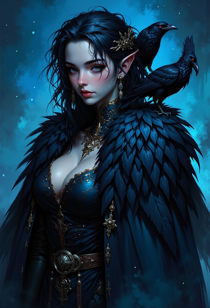 Style-GravityMagic, portrait, solo, upper body, looking down, detailed background, detailed face, (<lora:WoodIronAIv2:0.6>, WoodIronAI theme:1.1), raven-knight, dark feathers, wearing feathered cape, enigmatic, dark feathered wings, raven themed symbolism, raven sitting on shoulder, haunting aura, dark glowing mysterious runes in the air, underworld in background, dark night, starlit night sky, ethereal mist, mystical atmosphere, , medieval, 1200ad, grim, dark, line art a cappa, and coif Wide Nose, Full Lips, Shoulder-Length Hair, Curly Hair, full breasts, Goblin Market, Cyan, short toned and stocky girl with Jet black hair, (poised), ((sweaty wet skin)), ((Extremely toned small ass)), ((detailed erect nipples)), ((neatly-shaved pubic hair)), ((knees wide apart)), vibrant, rpg, 1400ad, ultra detailed, immersive, reminiscent of high fantasy RPG games, masterpiece, perfect face, perfect hands, award-winning, professional, breathtaking,, temperate Peninsula, comic, graphic novel art, pale white Green ribbons curvaceous figure