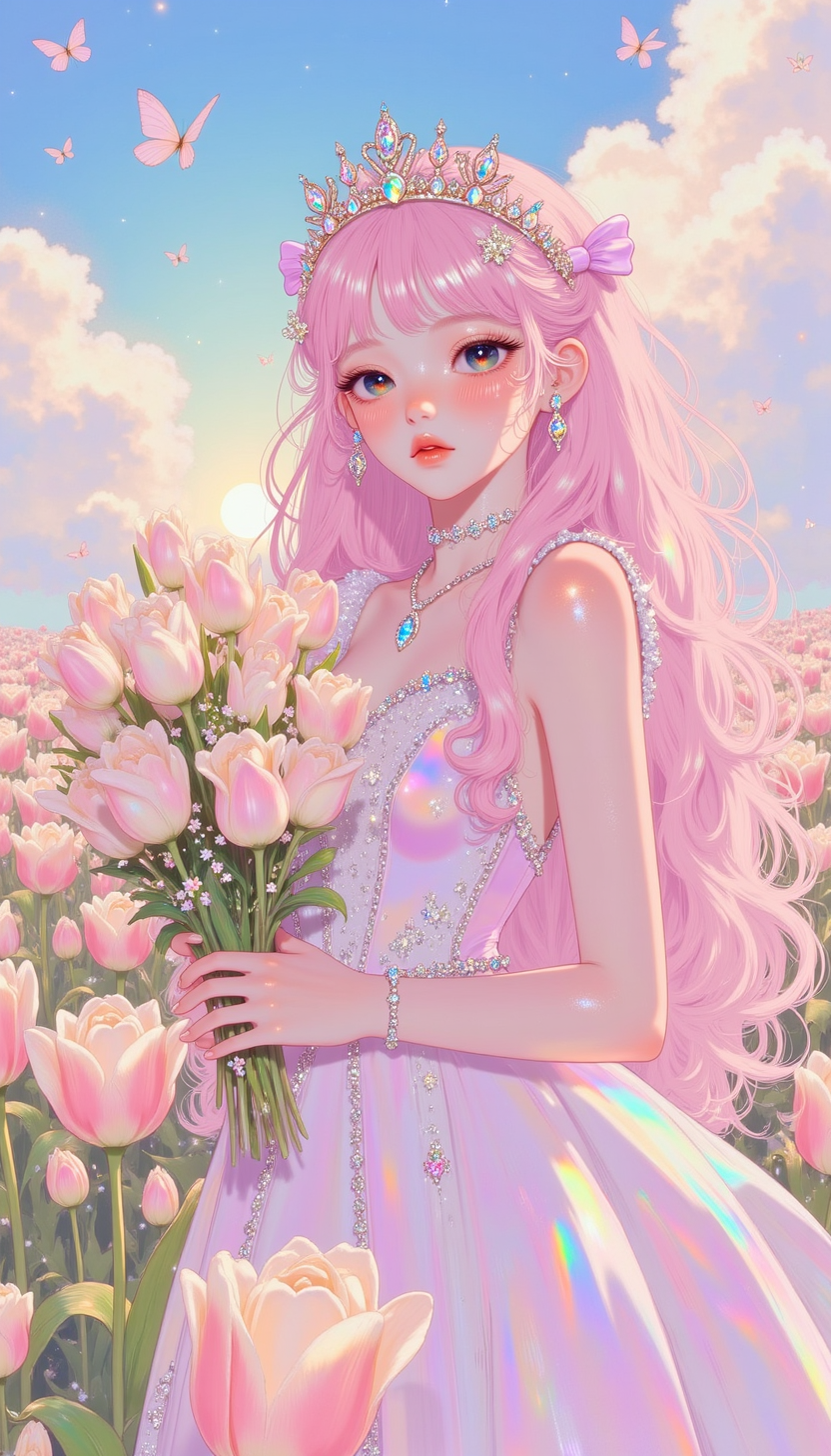 pinkprismaticglow, Depict spring illustrations with a soft color palette. A girl with long pink hair is very cute, princess dress, pink bow tiara, diamond necklace, earrings. With a dreamy look. She held a bunch of tulips in her hand. In the background is a colorful tulip field, and the soft, warm sun shines through the clouds. Shot up close, it gives a feeling of harmony and unity with spring nature.