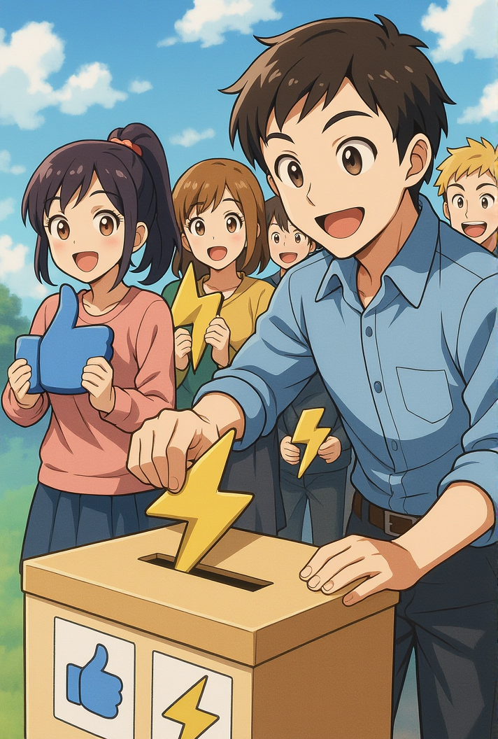 Anime-styled image of an election box where a person can choose to vote on either a "Like" icon or a "lightning" icon with a person holding a lightning icon in his hands and a long queue of people standing behind him waiting for their turn to put lightning or likes in the box.