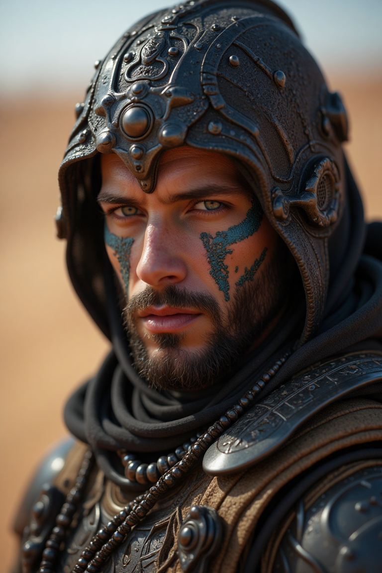 realistic half body portrait of battle scarred man, (((looking straight at the viewer))), Dune warrior, dessert planet, blue eyed from spice melange, best quality, very detailed, dressed in black, Canon 5D, Ultra skin, intricate wasteland clothing, precise hands, macro image detailed, badass look, Action, perfect eyes, extremely sharp focus face, analog fine film grain, cinematic, realistic, trend art station, Focus, studio photo, Details, by greg rutkowski, space colony, scavenger world, desert planet, sci-fi Art, complicated, busy, raw, 8 thousand, isometric, digital smog, 3d rendering, octane volumetry, sf, artistic masterpiece, vector graphic, threatening, Golden cut, cgsociety, Epos, elated, by Tom Bagshaw, Esao Andrews
