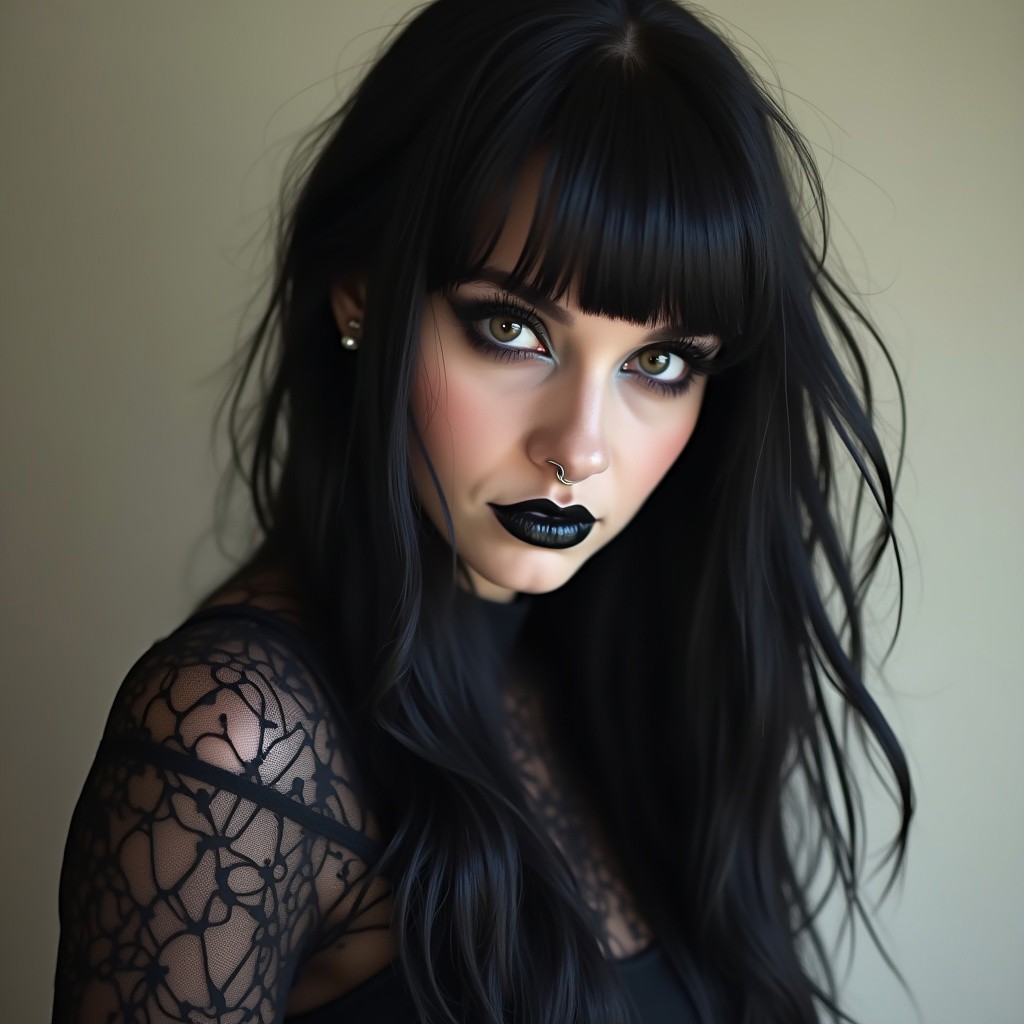 I'm like, 25, with long black hair in a messy bob and bangs. Think Wednesday Addams meets a total valley girl. My style? All black, usually in like, crop tops and shorts to show off my killer figure. I'm talking like, an hourglass but, ya know, with some junk in the trunk too. winks Add some heavy eyeliner, smoky shadow, and dark lipstick, and boom - that's me! Oh, and like, a nose ring on the left side.