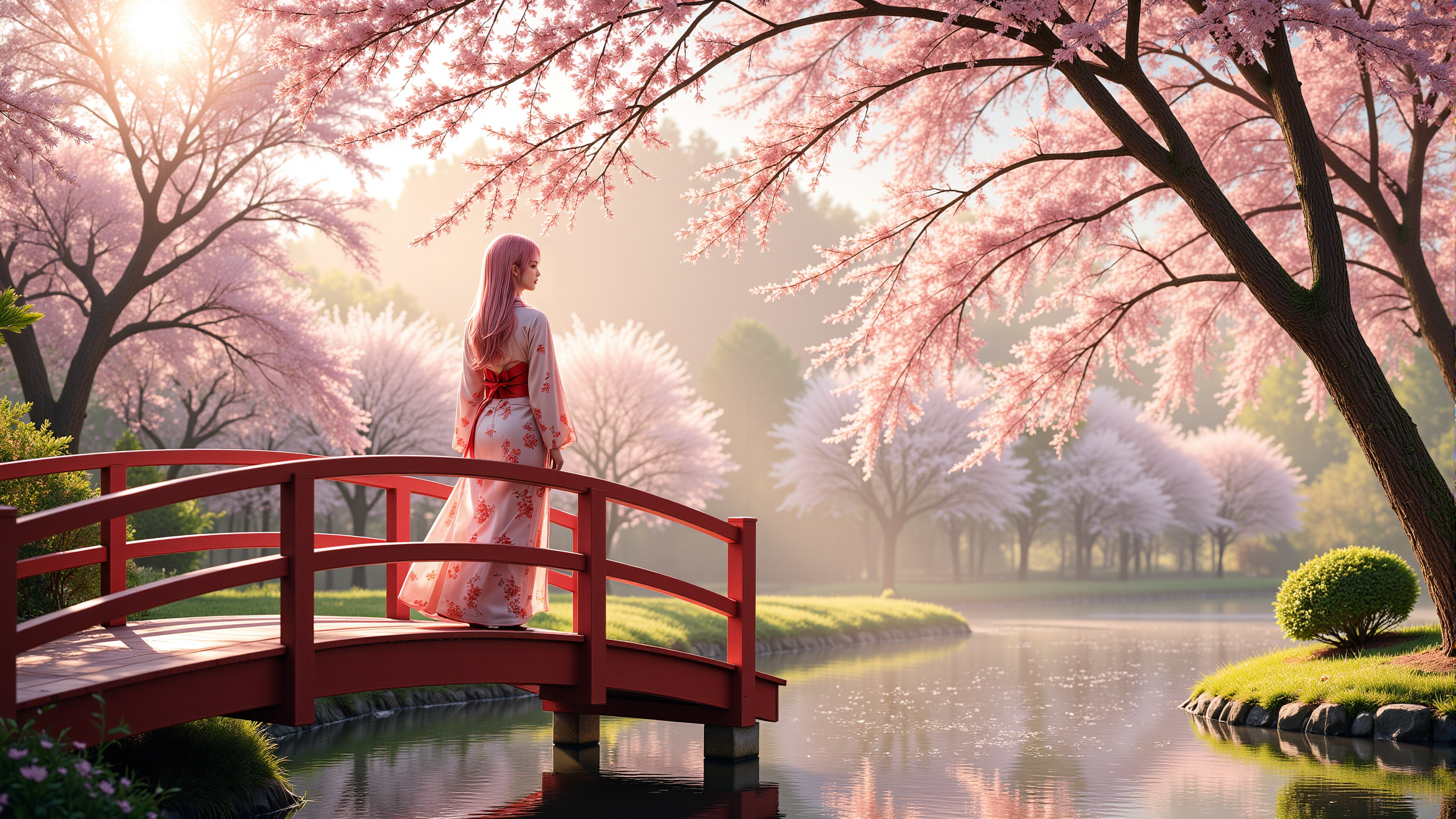 A peaceful Japanese garden in early spring,with a graceful 20-year-old woman with long pink hair in a flowing pink kimono standing on a red arched bridge,soft petals gently falling from a blooming cherry blossom tree,morning mist lingering above the water,warm golden light streaming through the trees,highly detailed,vivid style.,<lora:yuukananri-base-02-flux:0.7>,yuukananri,she has a slender physique and a petite build,<lora:aidmaMJ6.1v0.4:0.5>,aidmaMJ6.1,