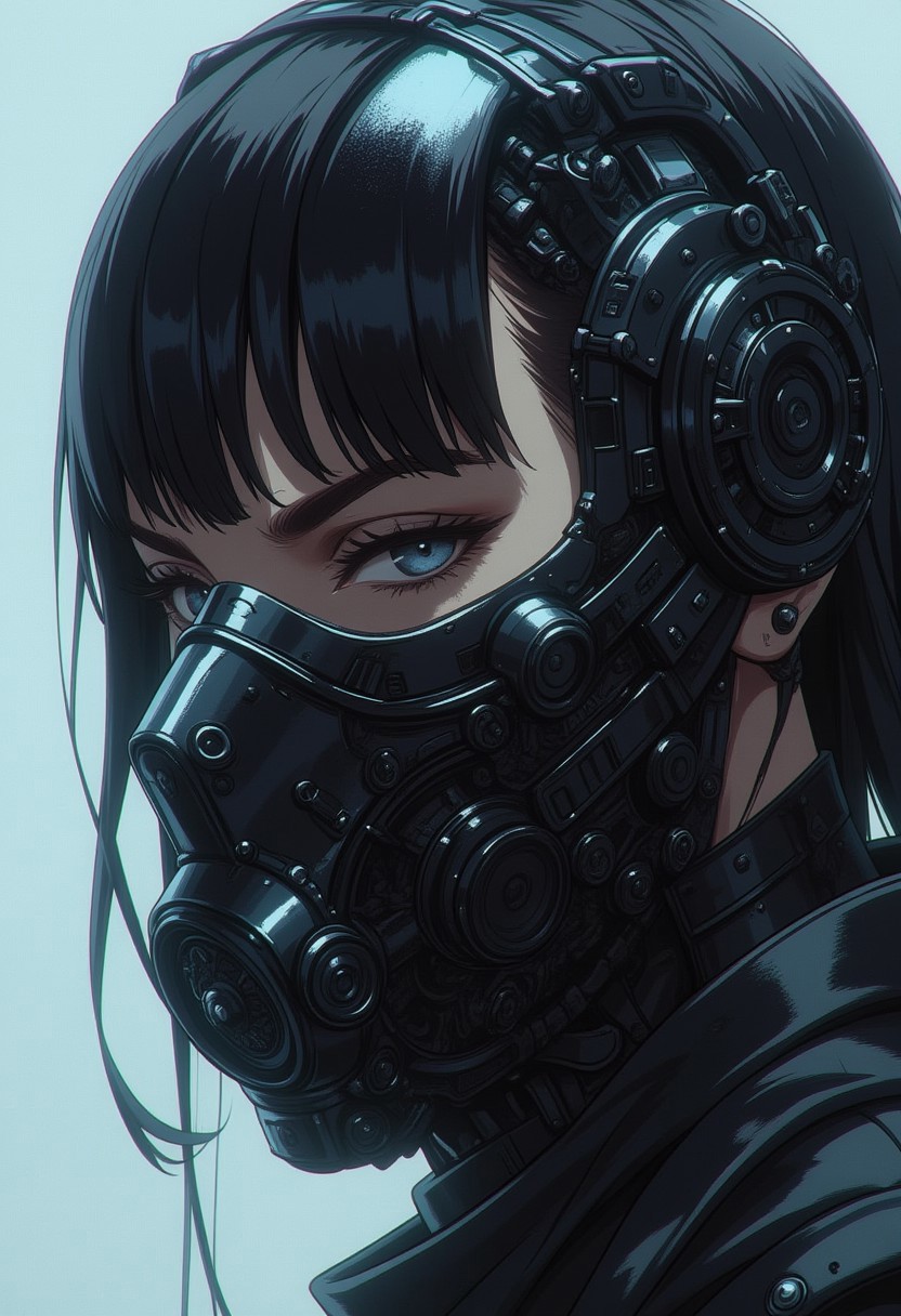 Close-up portrait of cyberpunk ninja "Phantom", her helmet placed aside revealing a partial face while maintaining an air of mystery