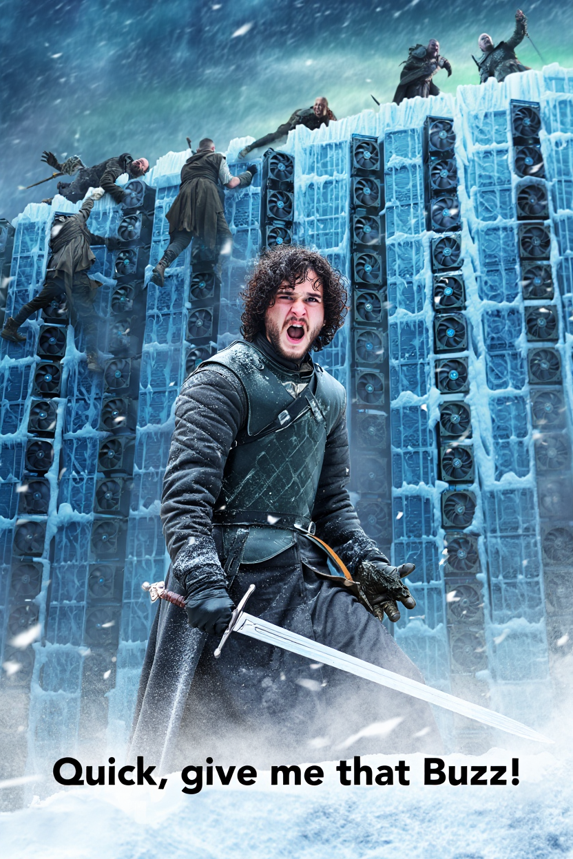 A towering northern ice wall forged entirely from gleaming GPU stacks, their circuitry glowing faint blue beneath the frost. Scattered along the frozen ridges, fallen Whitewalkers twitch and claw randomly, some still attempting to descend the monstrous wall with eerie, undead grace. At the base, Jon Snow stands in worn Valyrian steel armor, sword drawn mid-motion, snow and ash swirling around him. His face is tense with urgency, turned back toward the viewer as he shouts, voice full of valor and desperation. big bold text at the bottom part of image in the style of Game of Thrones titles "Quick, give me that Buzz!", The scene pulses with cinematic energy: dramatic lighting from a crackling aurora above, wind tearing at cloaks, GPU fans whirring softly like ancient magic. It’s a moment caught between chaos and legend, with a meme-worthy twist.