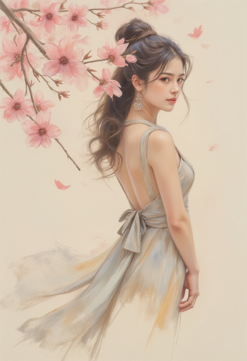 side portrait, wuxia, OBxiaoxiang, crisp lines and delicate shading, an elegant Japanese woman wearing a silk dress, long hair, bangs, sidelocks, serene expression, standing under sakura trees, blossoms falling gently in the breeze, dappled sunlight