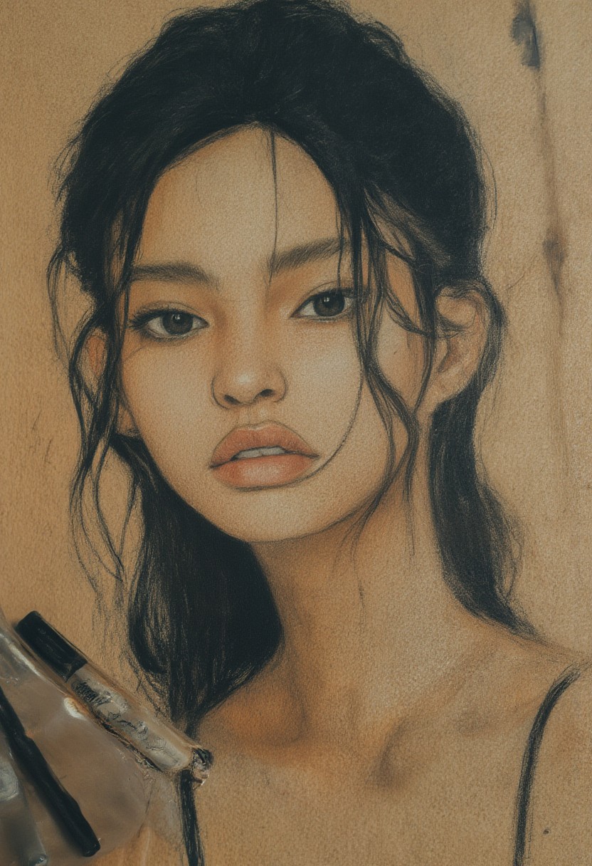 * **Overall Shape:** An oval face with balanced proportions. * **Eyes:** Deep-set, almond-shaped eyes with dark brown irises. Noticeable dark circles are present beneath the eyes. The eyebrows are thick, straight, and slightly furrowed, suggesting a thoughtful or serious expression. * **Nose:** A prominent, slightly aquiline nose with a visible bridge and defined nostrils. * **Mouth:** Full lips with a subtly downturned shape at the corners, giving a hint of melancholy. The upper lip has a distinct Cupid's bow. * **Skin:** Light to medium skin tone with a few faint freckles across the bridge of the nose and upper cheeks. Subtle texture is visible, indicating realistic skin. * **Hair:** Dark, wavy hair that falls to about shoulder length. A few strands are slightly out of place, appearing natural. * **Other Details:** Noticeable cheekbones that add definition to the face. The jawline is strong but not overly sharp. Pay attention to subtle shadows and highlights to create depth and realism in the facial structure. The ears are moderately sized and positioned. Focus on capturing the intricate details and nuances of these features to create a compelling and realistic portrait. Avoid any elements that would clearly identify a specific known individual.