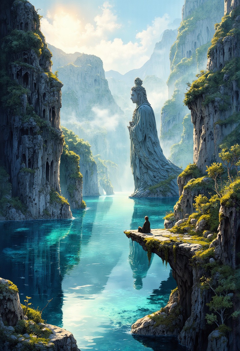 Studio Ghibli Dark Fairytale,Center of the picture, A serene, awe-inspiring shot of a person sitting peacefully on the edge of a high cliff, overlooking a vast, crystal-clear lake that stretches endlessly beneath them. The figure sits with knees drawn up, arms loosely wrapped around them, completely still—lost in the moment. The sun beams down warmly from a bright, cloudless sky, casting a golden shimmer across the water’s surface. The entire landscape is bathed in a tranquil, happy glow. Beneath the glassy water, clearly visible from the high vantage point, lies a monumental mythical statue—ancient and colossal. Its features are majestic and mysterious, carved with impossible detail, as if left behind by gods. The statue's form is partially submerged, one arm reaching upward as though in silent communion with the sky, its face calm and regal. Light dances over its surface, refracting through the lake and giving it an almost living presence. The surrounding cliffs and rocky ledges frame the scene like a natural amphitheater, emphasizing the grandeur and quiet magic of the place. There's no chaos here—only peace, wonder, and the quiet hum of nature’s enormity. The mood is joyful, reflective, and gently surreal—like stumbling upon a forgotten legend on a perfect, sunlit day.