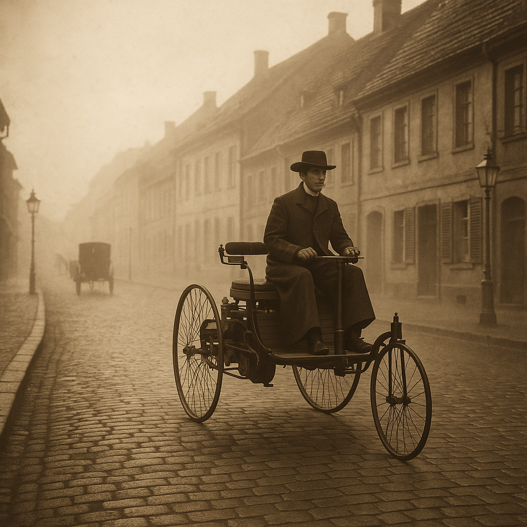 Circa 1890s: The Benz Patent-Motorwagen travels along a cobblestone street in Mannheim, Germany, on a serene summer morning. Golden early sunlight filters through light mist, casting soft shadows across tiled rooftops and gas-lit streetlamps. The three-wheeled vehicle rolls past brick storefronts and wrought-iron balconies, steered by a lone driver in era-accurate 1890s attire—long coat, high collar, wide-brimmed hat. The scene evokes the dawn of modern mobility, captured in the visual style of a late 19th-century albumen print—sepia-toned, softly vignetted, historically faithful, atmospheric, and cinematic