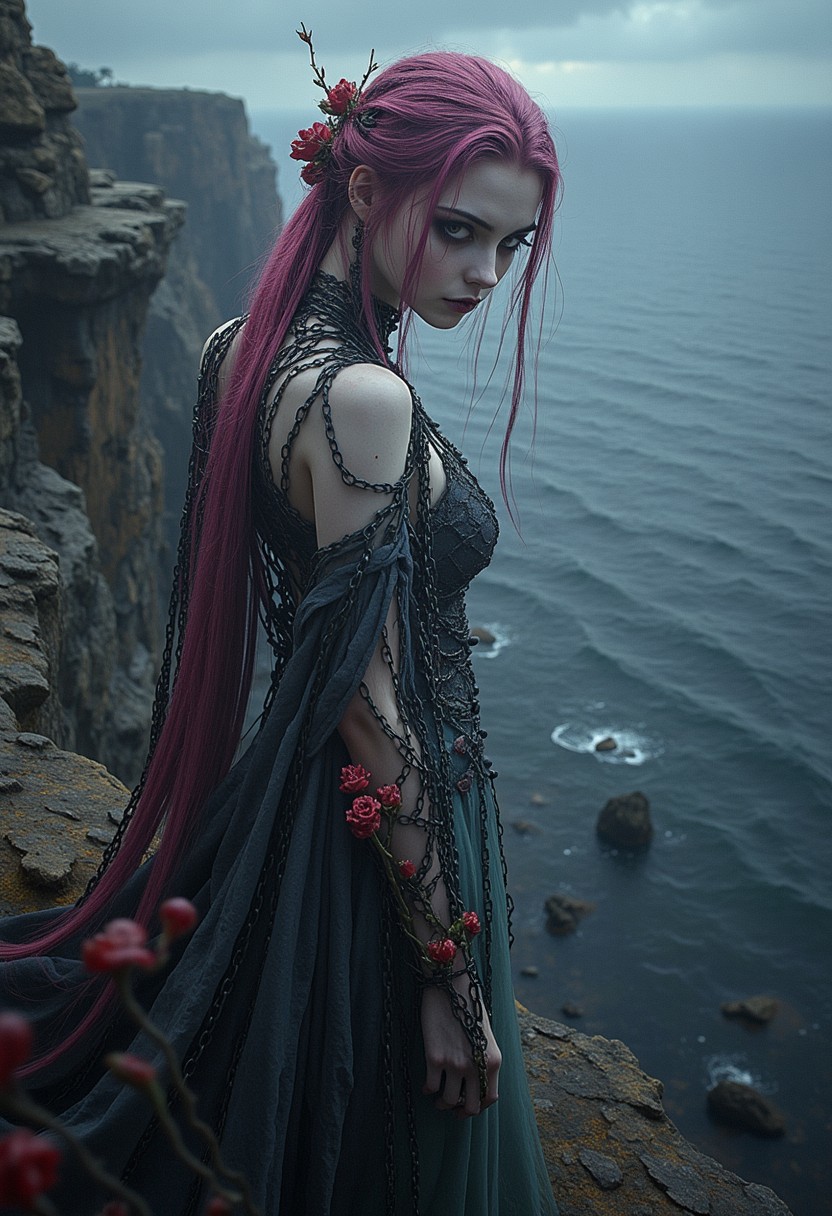 Hyperrealistic, cinematographic photography, vivid colors, and intricate details. A beautiful assemblage of a female creature with long, stringy hair. The figure has intense eyes. The creature is standing on a cliff overlooking a dark, foreboding sea. roses. ahx
