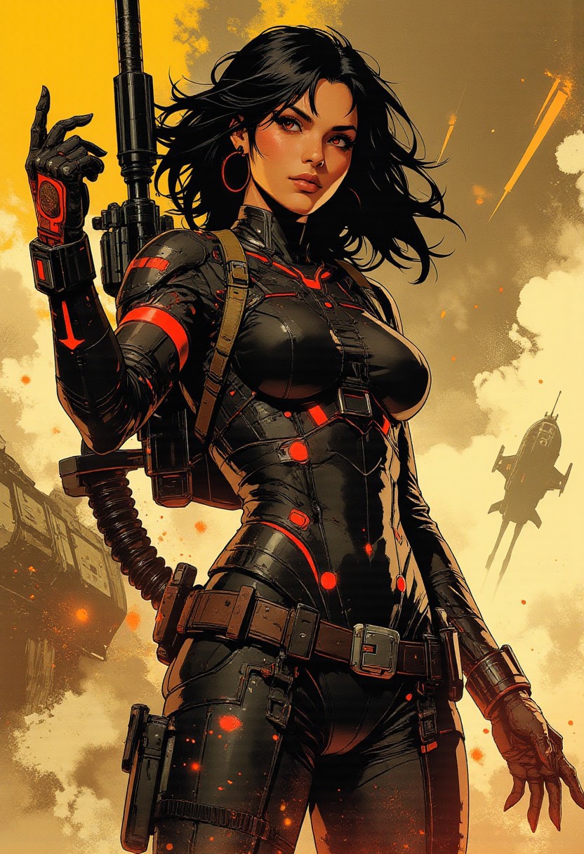 in the style of ck-mgs, nistyle, Inkplash art on rice paper, sepia, henna, Silhouette Art, magnificent, inksplash, closeup portrait, female bounty hunter, flowing black hair, reflective black and neon red armor, futuristic armor, sexy, curvy, large breasts, large ass, a rifle strapped to her back, holstered pistol, holding hand up, abstract background suggesting a harsh desert world, Spaceships flying overhead, dust storm, windy, Cowboy Shot, close up,