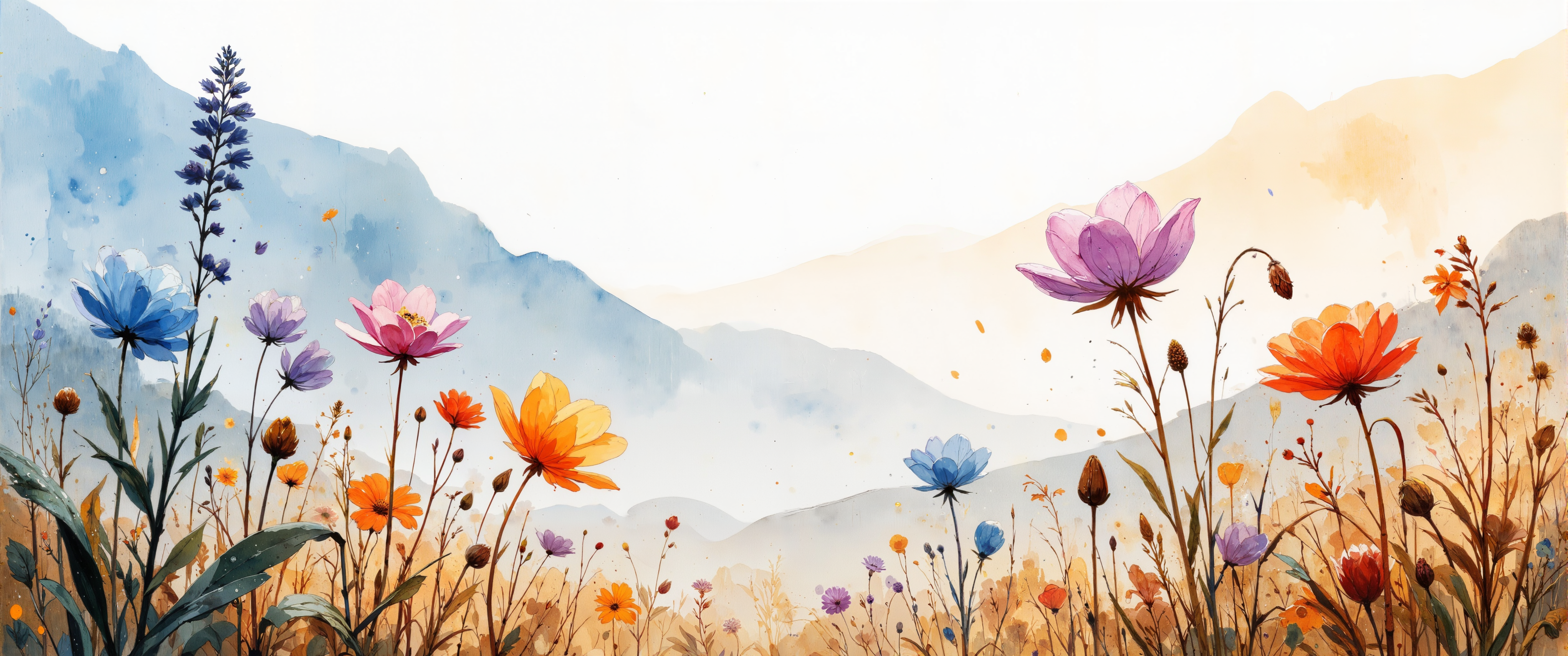 Delicate wildflowers emerging from misty mountain fog, rendered in dreamy watercolor washes with soft, bleeding edges where colors gently blend and diffuse. Translucent layers of cerulean blue and lavender create ethereal atmospheric depth, while golden morning light filters through, illuminating dewdrops that glisten on petals with jewel-like transparency. The heavyweight cotton paper's subtle texture shows through where pigment pools at edges, creating organic, crystalline patterns. Each flower stem dissolves into the background with feathered brushstrokes, while foreground details maintain subtle definition through controlled wet-on-dry technique. Color transitions from cool shadow areas to warm highlights capture the ephemeral quality of dawn light breaking through mist. Masterful negative space preserves the white of the paper for luminous highlights, while delicate spattering suggests morning dew. A harmonious palette of muted earth tones and vibrant petal colors creates a serene, contemplative mood that celebrates nature's fragile beauty through the distinctive luminosity only watercolor can achieve. <lora:Rainbow_on_black_style-000003:0.1> <lora:Classic_Anime_Colors:0.5> <lora:Bonafida.Studio:0.3> <lora:飿 ¼å-è¶ ç°å®:0.5> <lora:Organic Sauce - FLUX:0.8> <lora:flux_dev:1>