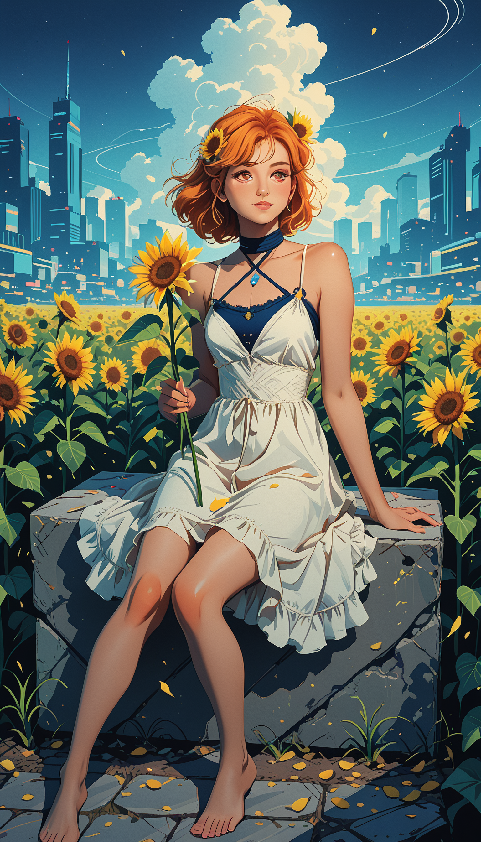 masterpiece, Shinkaistyle, pinkretroanime, retro art, Cyberpunk Style, cyberpunk, science fiction, hi tech, future tech, neon, (Cybernetics:1.25), (Neon Cityscape:1.4), (lineless:1.5), smooth edges, (lighten the face:1.5), tall body, slender body, fit body, long legs, In the image, a young anime-style girl with short blonde hair and large, expressive blue eyes is sitting in a field of sunflowers. She's wearing a white dress with a dark blue collar and a small black choker adorning her neck. The field extends out behind her, creating a sense of depth, and the flowers are vibrant yellow, suggesting it might be late afternoon or early evening due to the soft lighting. The girl appears contemplative, holding a sunflower in her hand. She has a slight smile on her face as she looks off into the distance. Behind her, the sky is a deep blue with a few wispy clouds, hinting at a clear and serene day. The overall atmosphere of the image is one of tranquility and youthful innocence, evoking a sense of peace and simplicity., 1girl, solo, breasts, looking at viewer, blush, smile, short hair, bangs, blonde hair, hair ornament, red eyes, dress, ribbon, holding, hair between eyes, bare shoulders, medium breasts, sitting, closed mouth, collarbone, full body, yellow eyes, flower, small breasts, outdoors, frills, sky, barefoot, sleeveless, alternate costume, day, hairclip, hair flower, dark skin, medium hair, white dress, orange hair, dark-skinned female, orange eyes, bare arms, petals, bare legs, night, sleeveless dress, shadow, halterneck, from above, expressionless, frilled dress, looking up, tan, knees together feet apart, crossed bangs, yellow flower, sunflower, criss-cross halter, holding flower, spaghetti strap, sundress, chromatic aberration, field, summer, flower field, halter dress, sunflower hair ornament