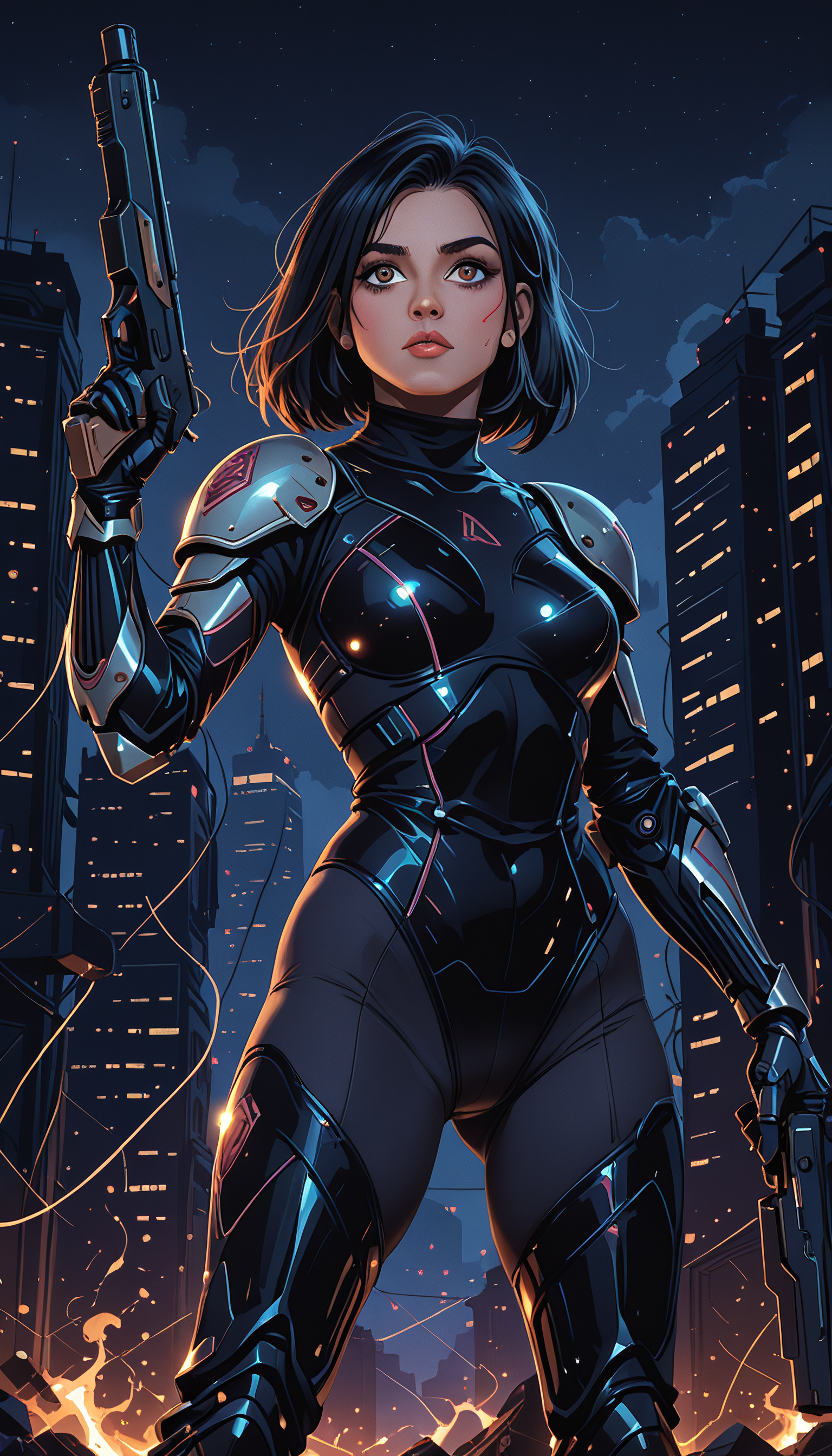 masterpiece, Shinkaistyle, pinkretroanime, retro art, Cyberpunk Style, cyberpunk, science fiction, hi tech, future tech, neon, (Cybernetics:1.25), (Neon Cityscape:1), (lineless:1.5), smooth edges, (lighten the face:1.5), tall body, slender body, fit body, long legs, In this digitally rendered image, we see the main character, a young woman, standing assertively in the foreground. She is clad in a futuristic armor that appears to be a high-tech suit with intricate details and patterns, predominantly featuring blues and purples with accents of white and silver. The helmet she wears has a visor that conceals her face and eyes, leaving only her mouth partially visible, suggesting she is speaking or about to speak. She holds a gun in her right hand, pointing it towards the viewer, which gives an impression of readiness or engagement with potential threats. Her left arm is extended outward, displaying a mechanical design with glowing lights and what appears to be a built-in weapon or tool. The armor and weaponry suggest she is prepared for combat or exploration in a technologically advanced environment. The background features a dilapidated urban landscape with crumbling buildings and debris scattered around. A large structure resembling a futuristic skyscraper looms in the distance, partially obscured by clouds. The lighting in the image is dramatic, with a mix of harsh shadows cast by the character onto the buildings, and ambient light that gives off an otherworldly glow. The overall atmosphere of the image is one of intensity and anticipation, with the viewer's gaze drawn to the central figure, creating a sense of suspense as to what her next move will be in this dystopian setting. The image does not contain any text. (Alita Battle Angel:1.9), (night:1.95), (dark sky:1.8), (dark background:1.7), (twilight:1.5), 1girl, solo, breasts, looking at viewer, short hair, bangs, black hair, thighhighs, gloves, holding, brown eyes, medium breasts, closed mouth, standing, weapon, thighs, boots, outdoors, sky, day, black thighhighs, cloud, medium hair, holding weapon, armor, black eyes, leotard, lips, gun, grey eyes, bodysuit, feet out of frame, frown, thigh boots, highleg, ass visible through thighs, facial mark, expressionless, bob cut, cloudy sky, fire, building, holding gun, black leotard, skin tight, rifle, handgun, highleg leotard, smoke, science fiction, dual wielding, legs apart, contrapposto, serious, city, realistic, nose, facepaint, mechanical arms, ruins, trigger discipline, shoulder pads, facial tattoo, cyborg, single mechanical arm, prosthesis, skyscraper, shotgun, finger on trigger, cyberpunk