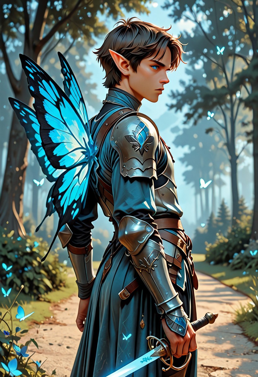 score_9_up, score_8_up, score_7_up, score_6_up. masterpiece, best quality, good quality, very aesthetic, absurdres, semirealism, hkvaloria, RapierXL, fantasy, 8K, depth of field, focused subject, cowboy shot, Elf knight, 19yo male, androgynous, pointed ears, short brown hair, male haircut, blue eyes, wearing detailed armor, he is standing, holding sword, rapier, weapon, blue glowing sword, large white glowing butterfly wings on the knight's back, park,