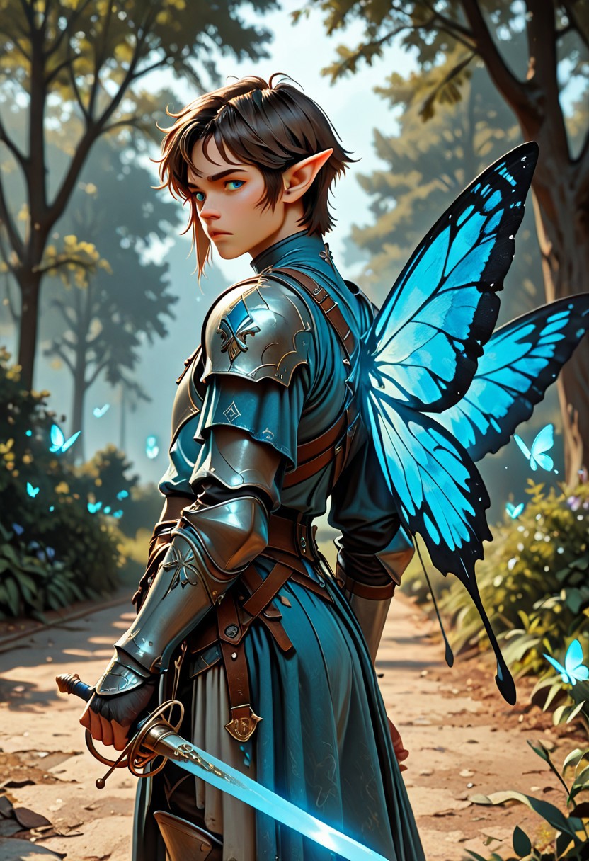 score_9_up, score_8_up, score_7_up, score_6_up. masterpiece, best quality, good quality, very aesthetic, absurdres, semirealism, hkvaloria, RapierXL, fantasy, 8K, depth of field, focused subject, cowboy shot, Elf knight, 19yo male, androgynous, pointed ears, short brown hair, male haircut, blue eyes, wearing detailed armor, he is standing, holding sword, rapier, weapon, blue glowing sword, large white glowing butterfly wings on the knight's back, park,