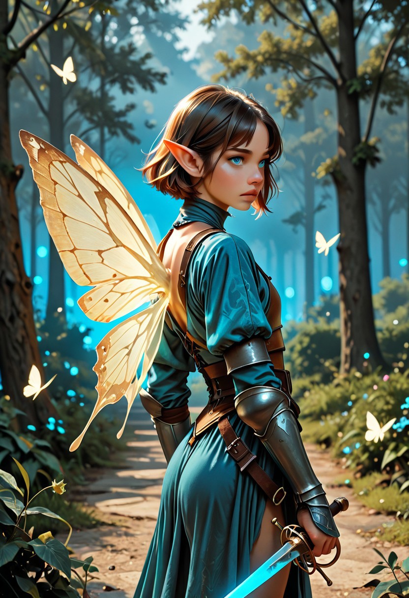 score_9_up, score_8_up, score_7_up, score_6_up. masterpiece, best quality, good quality, very aesthetic, absurdres, semirealism, RapierXL, fantasy, 8K, depth of field, focused subject, cowboy shot, Elf knight, 19yo male, fairy, androgynous, pointed ears, short brown hair, male haircut, blue eyes, wearing detailed armor, he is standing, holding sword, rapier, weapon, blue glowing sword, large white glowing butterfly wings on the knight's back, park,