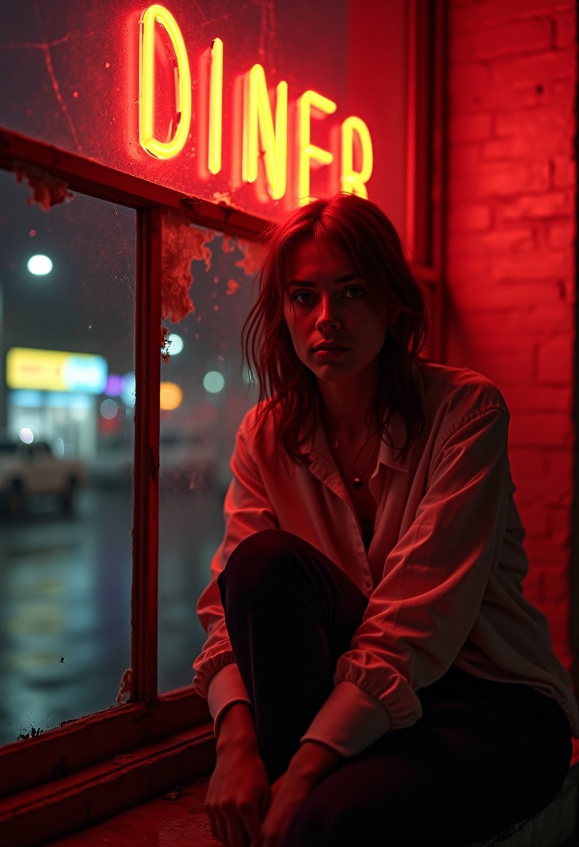 A sleep-deprived young woman (23-24) with disheveled brown hair sits on the cracked windowsill of an abandoned hallway, her wrinkled office shirt soaked in the pulsating red glow of a neon "DINER" sign across the street. She stares directly at the viewer with hollow eyes, her face half-lit by the violent crimson light, half-swallowed by the darkness of the derelict corridor. The shattered window behind her frames a 3 AM cityscape—overflowing garbage bags, the toxic fluorescence of an all-night bodega, and the distant specter of Manhattan's skyline dissolving into rainclouds. The floorboards creak with unseen weight; the only furniture is the skeletal remains of a coatrack toppled near the peeling walls. The photo sears with contrast: the neon's electric red bleeds onto her collarbones and hands like liquid light, while the rest of the hallway drowns in inky blackness. Shot on expired 35mm film with a malfunctioning flash, the image burns at the edges—overexposed highlights clawing at the negative space where the ceiling should be. Rain lashes the broken windowpanes, the droplets frozen mid-fall by the camera's shuddering shutter speed.Film grain resembling Ilford HP5 pushed to 1600 ISO"