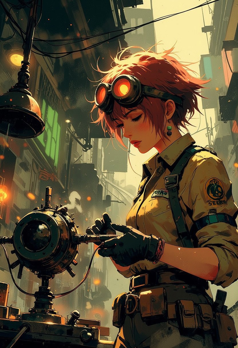 Mh1$AgThS2, intricate linework with expressive contrasts, soft lighting with dynamic highlights, A tomboyish engineer lady with very short red hair and green eyes in a steampunk city bazaar. She wears a dirty jumpsuit, goggles and gloves as she tries to fix an intricate gadget. Golden-hour glow.