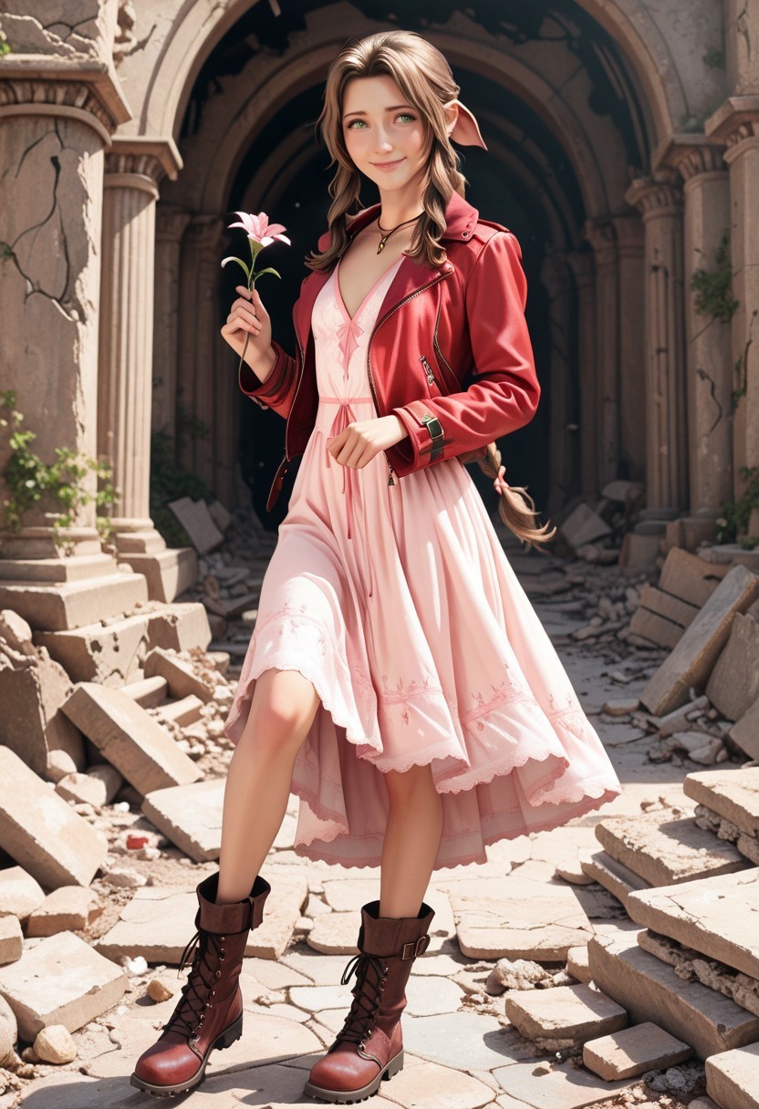DisneyStudioXL, cinematic, masterpiece, 4k, high quality, (best quality:1.1), ancient ruins background,face focus, 1girl,FF7Aerith, 1girl, brown hair, green eyes, long hair, braided ponytail,solo,masterpiece,best quality,amazing quality, 1girl,((wearing pink dress,wearing red jacket,boots,,cute face,slim body,small breasts,holding flowers,standing,leg up,legs apart,shy face,shy smile,large eyes,sweet expression,)), ((slight view from the side,standing,legs visible)), ExpressiveH, in heat, looking at viewer, wincing, standing,posing <lora:DisneyStudios_style-12IL:1>