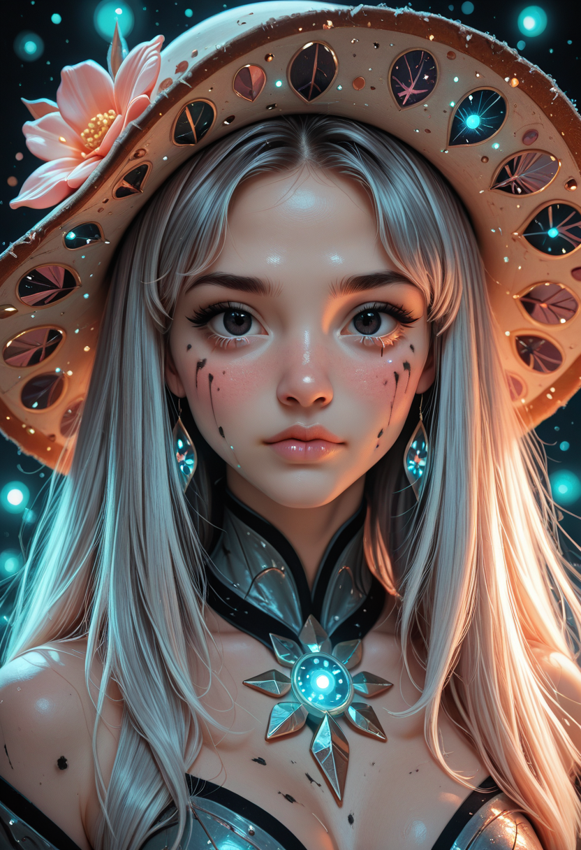 1girl, sexy:2, cute:2, high_quality, highres, detailed_eyes, beautiful, detailed, masterpiece, best quality, absurdres, 8k, HDR, face_focus, blush, looking at viewer, retro, grunge, A stunning close-up portrait of a cute celestial star-navigator cascading auburn curls framing her face cold, sterile light from holographic displays reflecting on her features beneath a wide-brimmed hat casting her face in shadow Tears like liquid starlight frozen on her cheeks her deep void-black eyes seem to absorb all light, reflecting nothing leaving faint trails of ethereal light as she moves She walks through a field of glowing, alien flora the air thick with the scent of ozone and ancient magic Monochromatic tones of grey and silver emphasize form and shadow evoking a sense of untamed strength, fierce independence, and regal command., <lora:Smooth_Booster_v2:0.8>